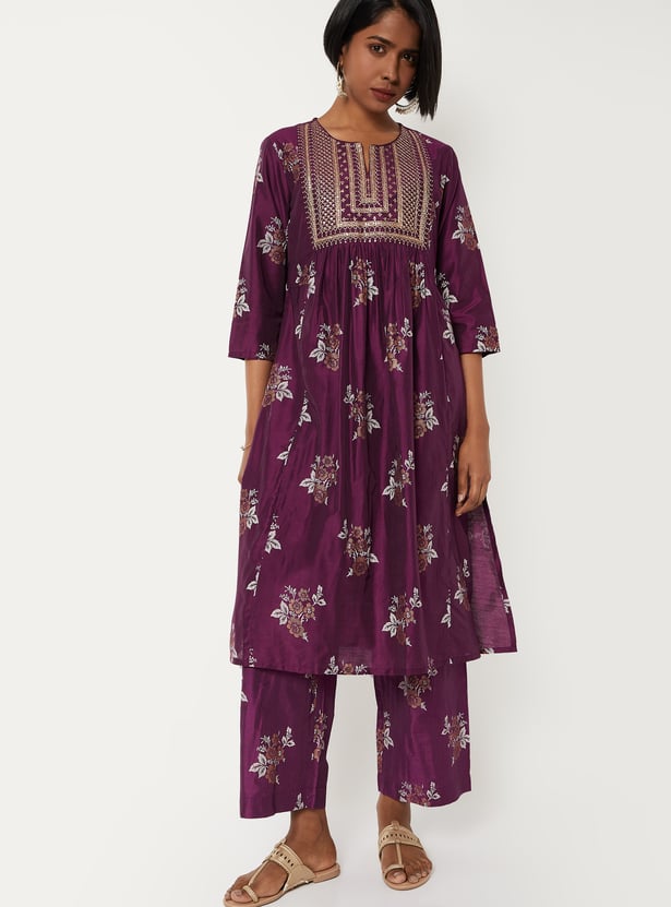 Stylish and comfortable, this floral print A-line kurta set features a notched neckline and 3/4th sleeves. It is paired with matching palazzos with an elasticated waist, offering elegance with everyday ease.