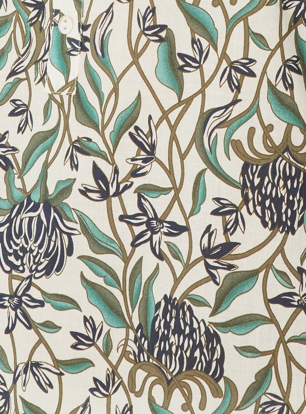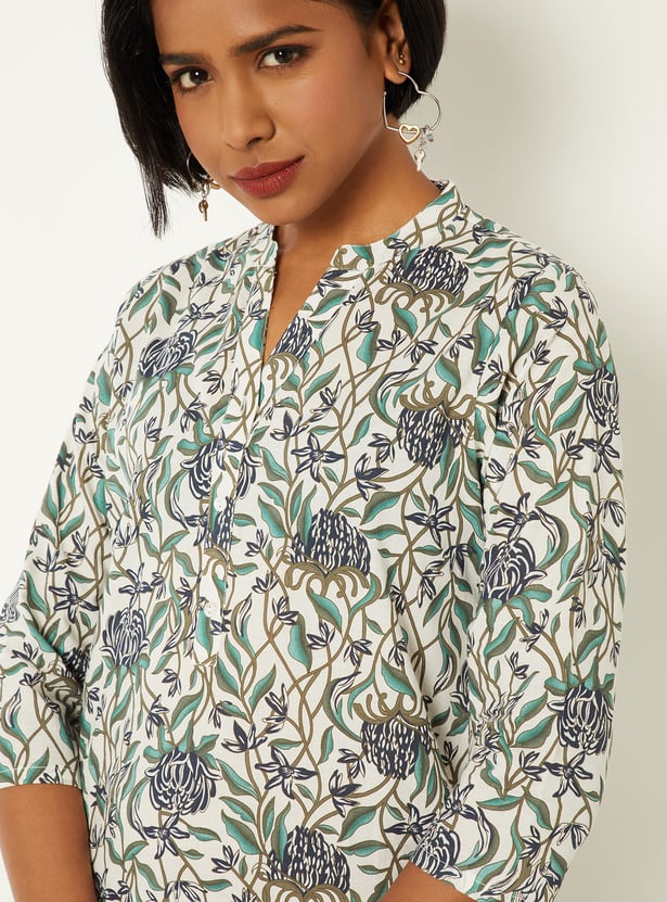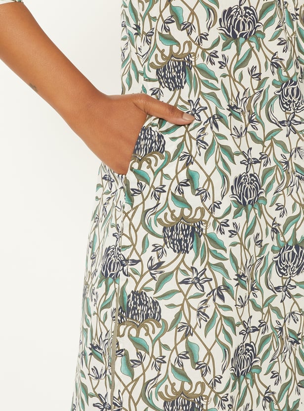 This all-over floral print straight kurta features a band collar and 3/4th sleeves for a clean, contemporary look. A functional side pocket adds everyday practicality to the streamlined silhouette.