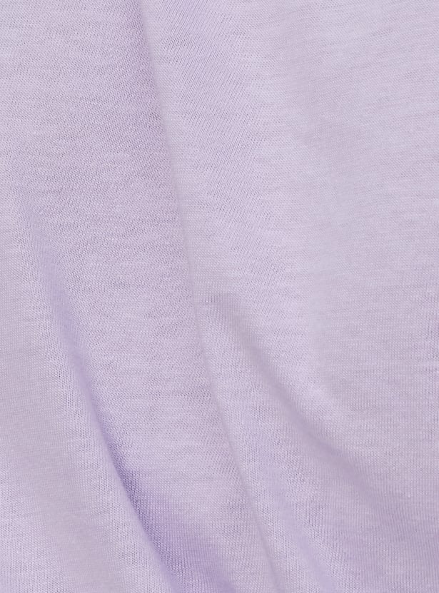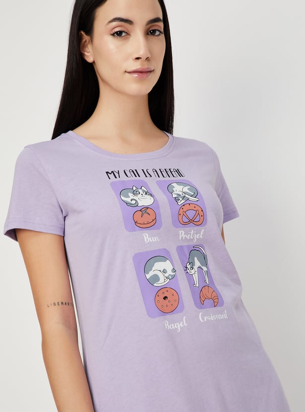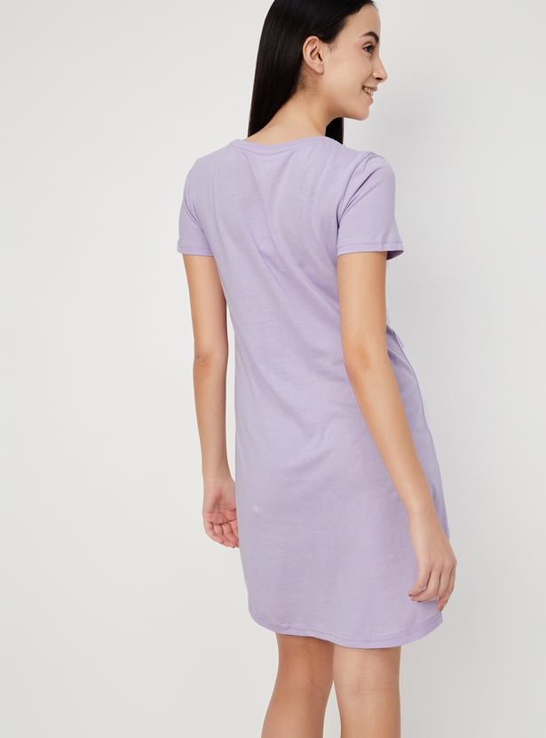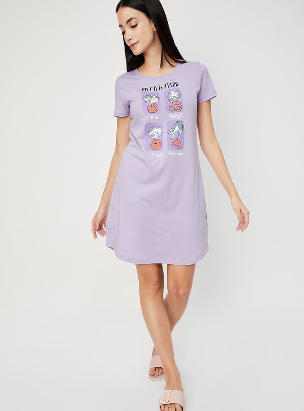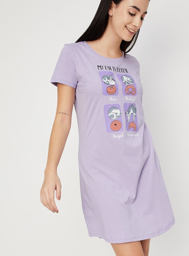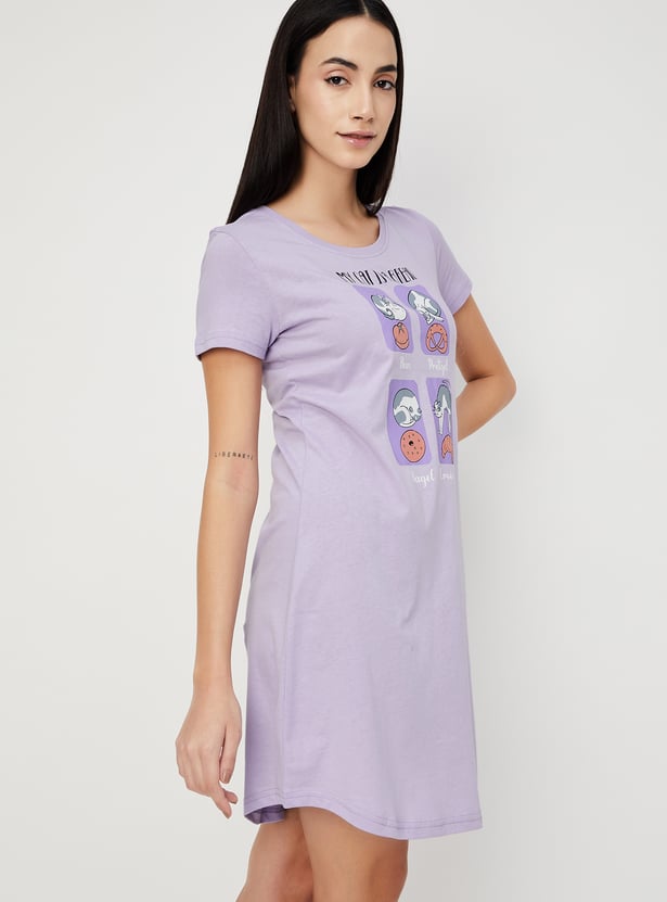 Relax and chill at home with this comfy chemise, featuring a round neck, short sleeves, and a cute graphic print on the front. Perfect for lounging in style and comfort.