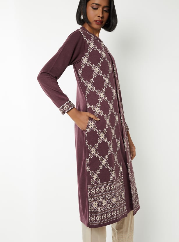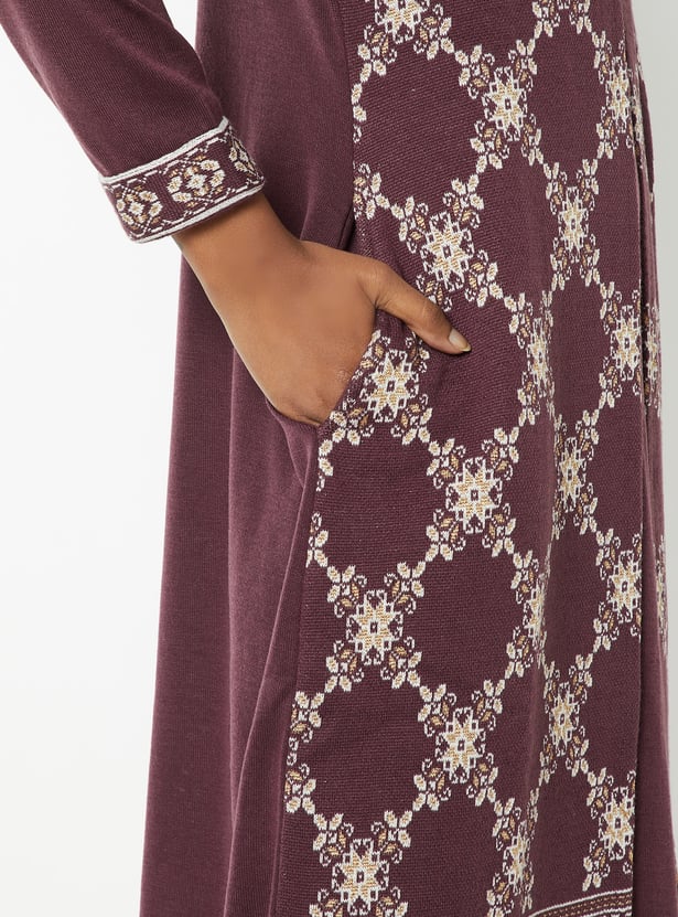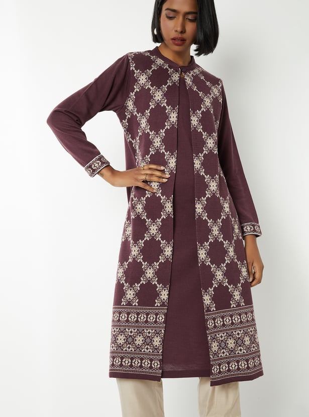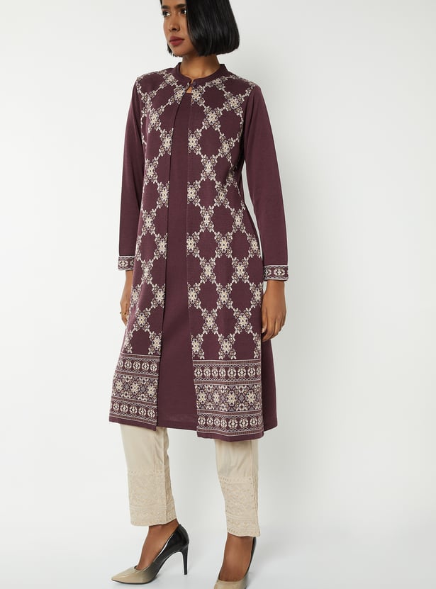 Stay warm and chic in this knit layered A-line winter kurta. Featuring a classic round neck and full sleeves, its soft knit fabric and layered design add texture and depth—perfect for cozy days with a touch of elegance.