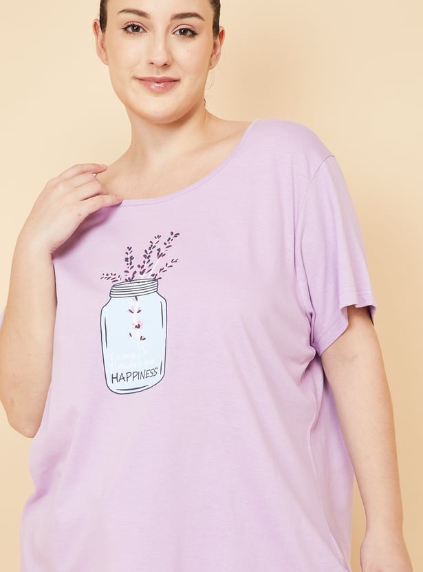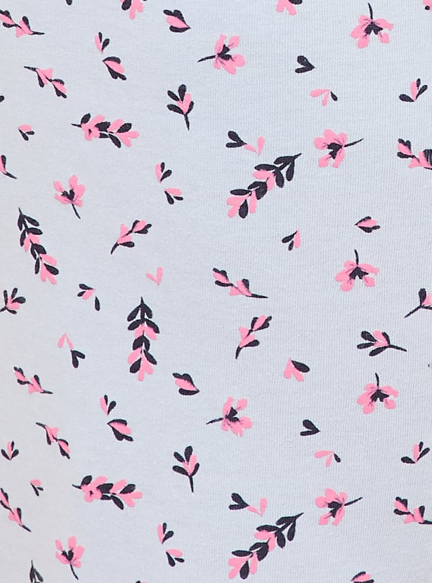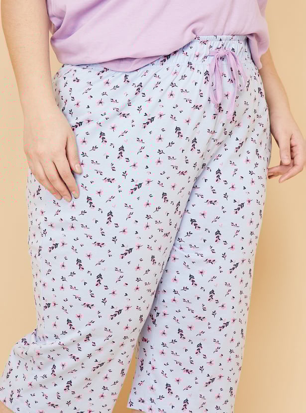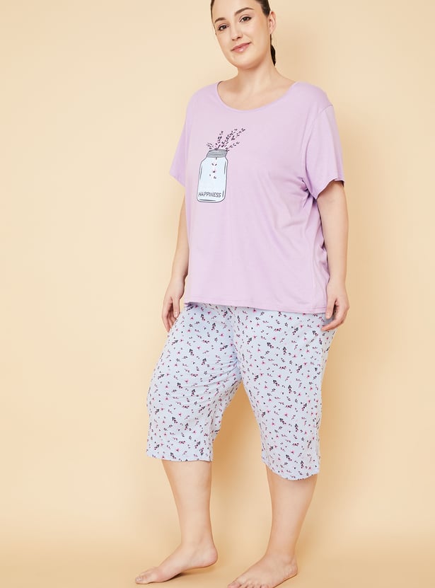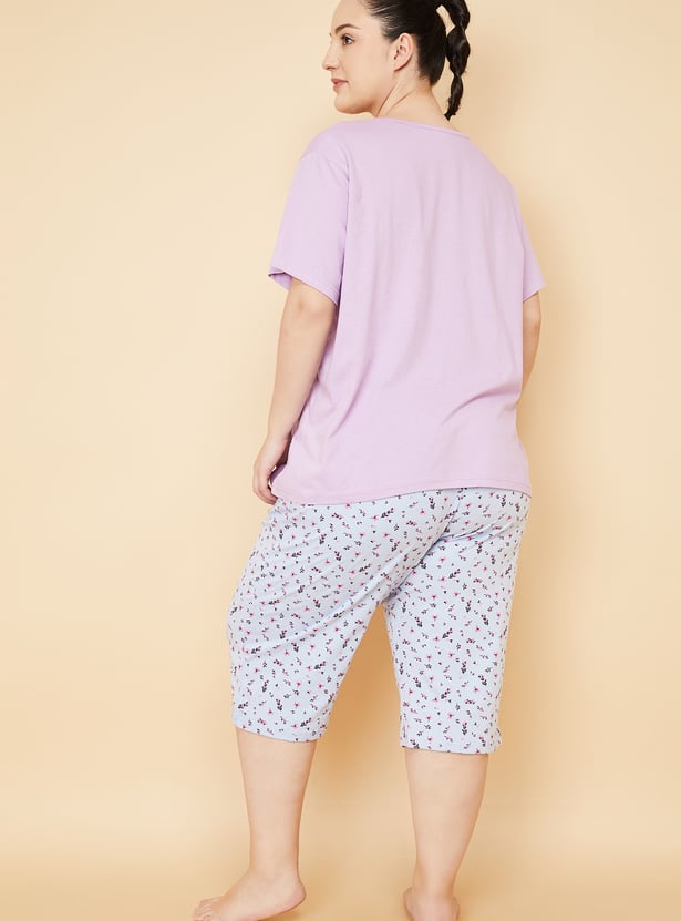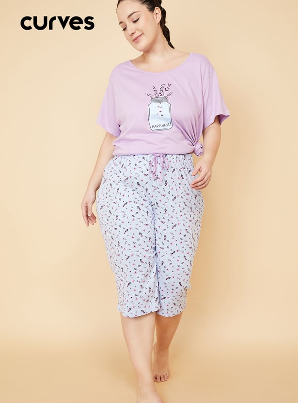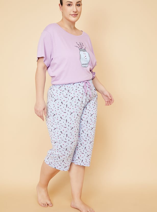 Enjoy a restful slumber in this sleep set. It features a T-shirt with a round neckline, short sleeves, and a graphic print on the chest. This tee is contrasted with a pair of capris featuring floral prints and a drawstring waist.