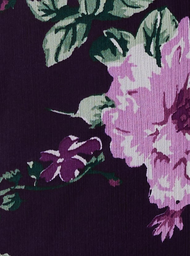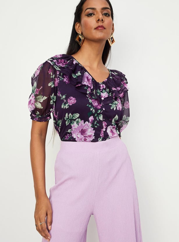 Breezy and elegant, this blouse is a perfect addition to your work wardrobe. It has a V-neck, all-over prints, riffled detailing, and puffed sleeves. Style this blouse with palazzos and block heels to ace the look.
