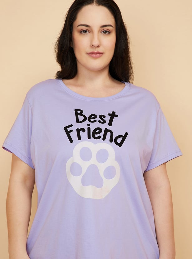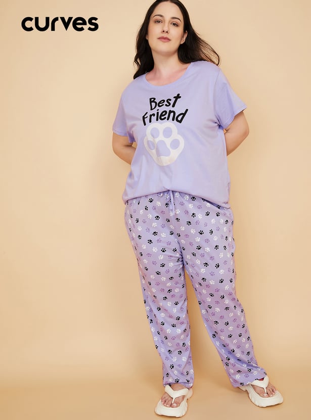Stay cozy and stylish in this printed pyjamas set featuring a round‑neck, half‑sleeve top paired with pyjamas designed with an elasticated waist and drawstring. Perfect for lounging or bedtime comfort. Model Size :