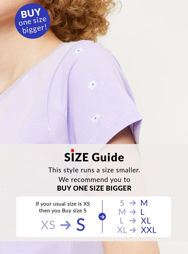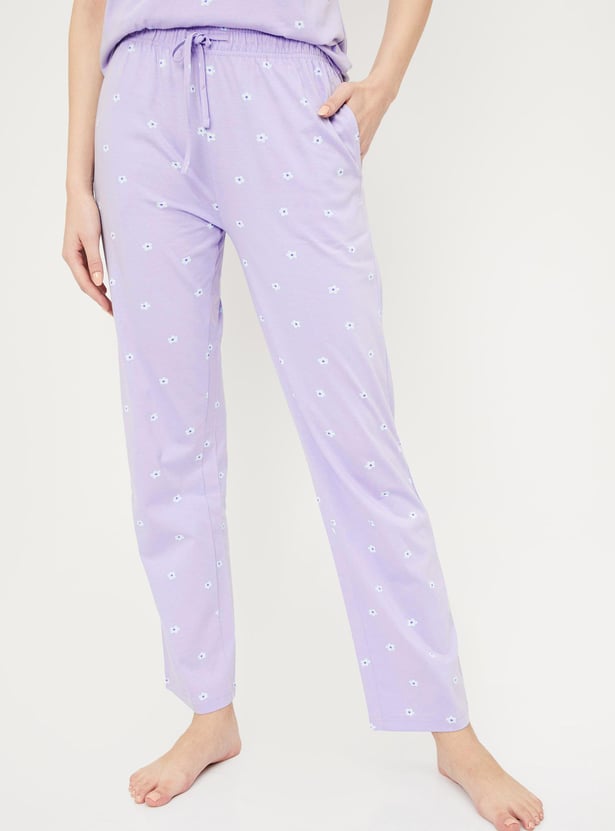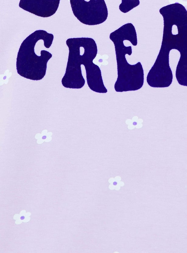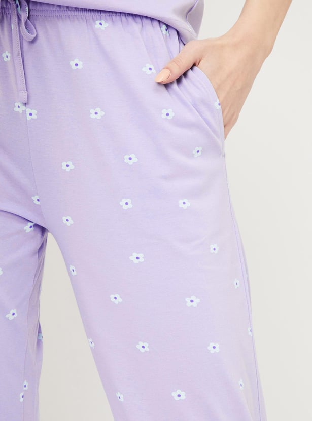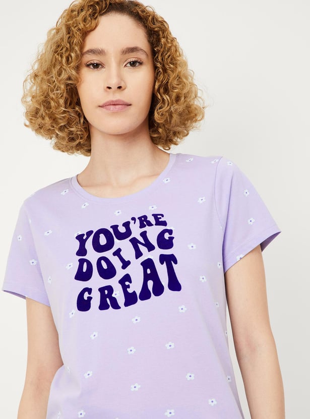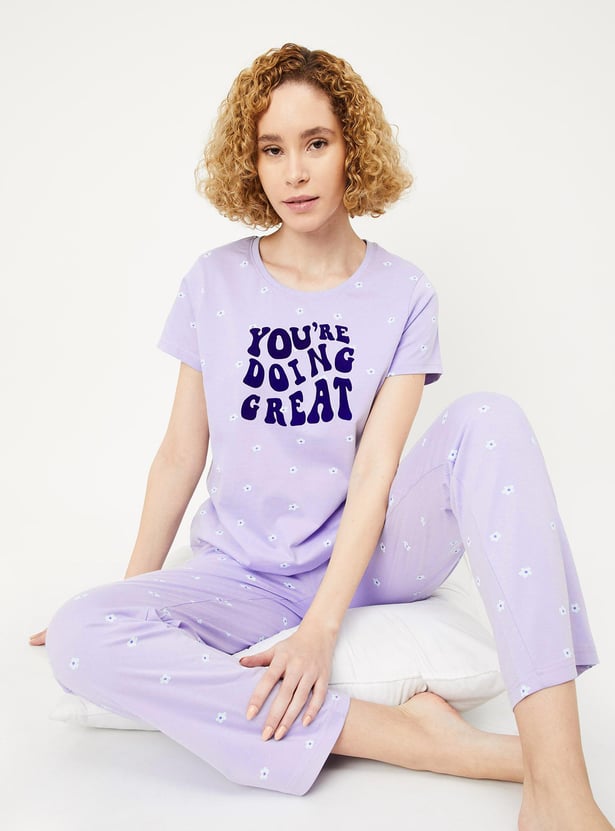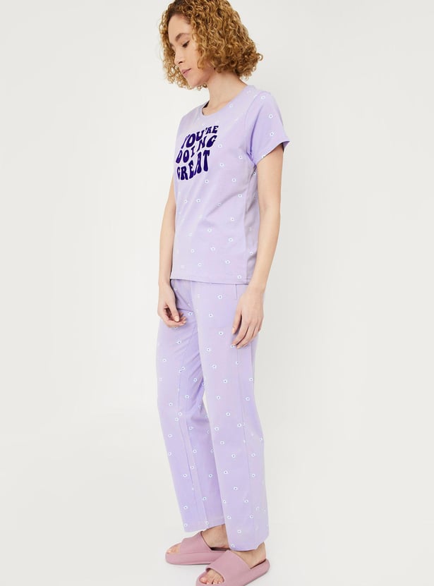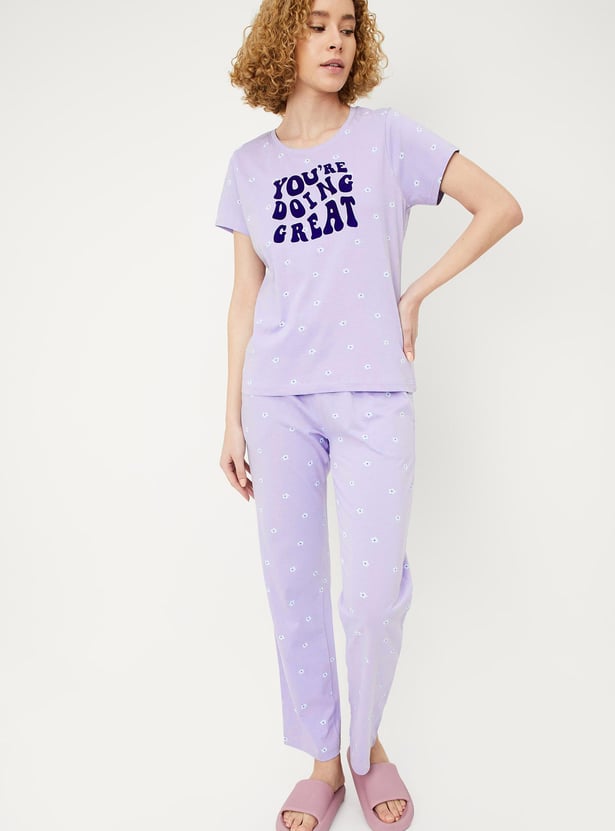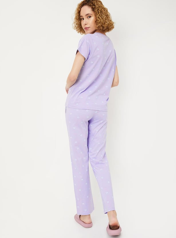 Relax and chill with this printed sleepwear set. It includes a T-shirt with a round neck and half sleeves along with a pair of matching all-over printed pyjamas with an elasticated waist and drawstring.