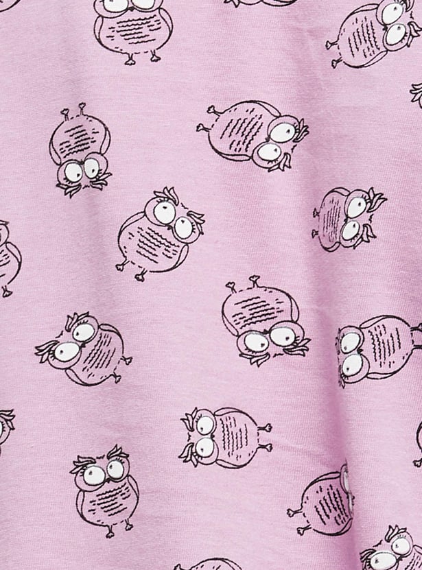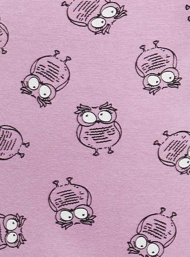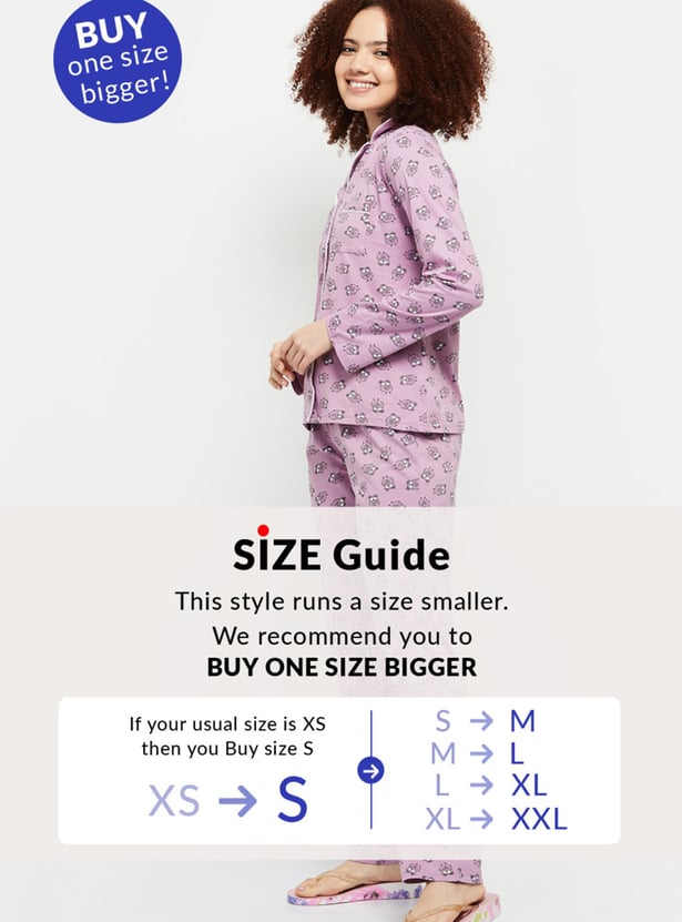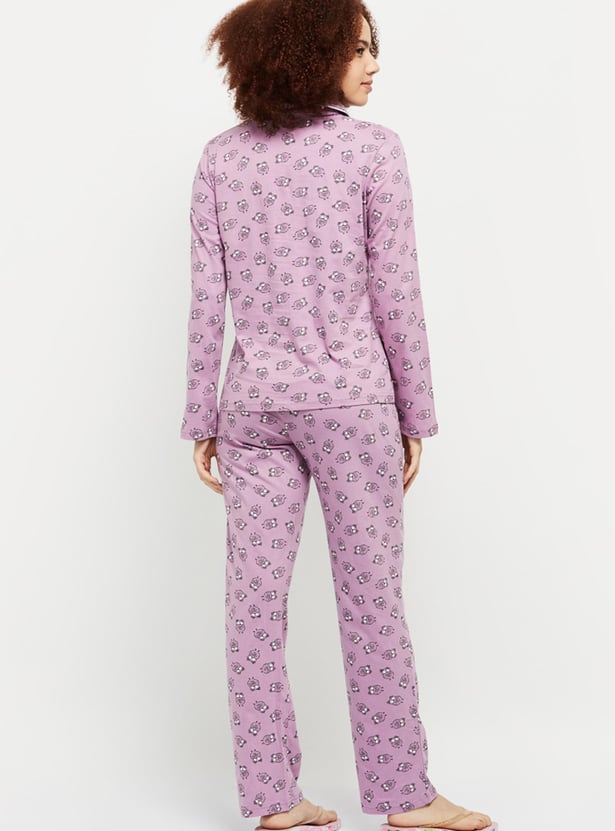 Style in comfort with this lounge set. This set comes with a printed shirt designed with a collared neckline and full sleeves and a pair of elasticated pyjamas.
