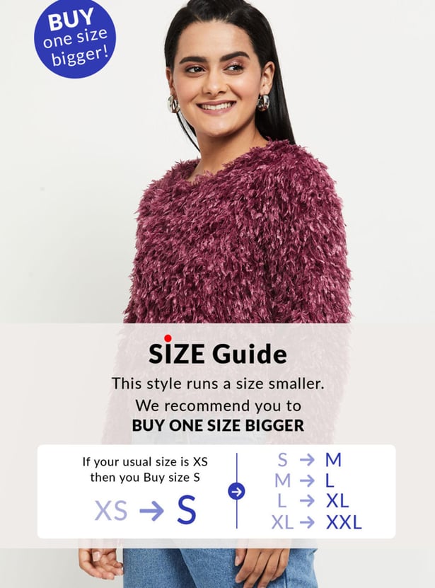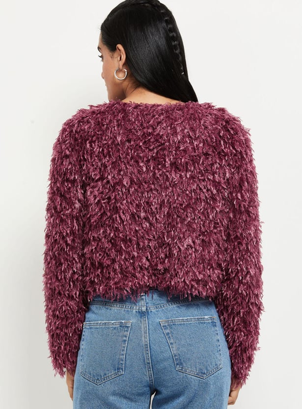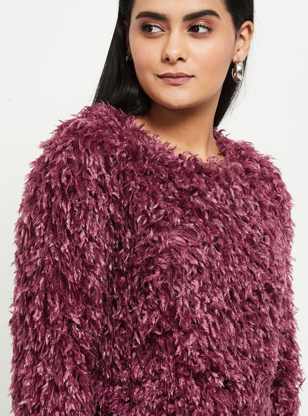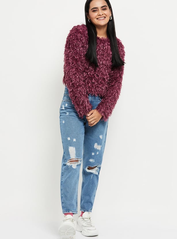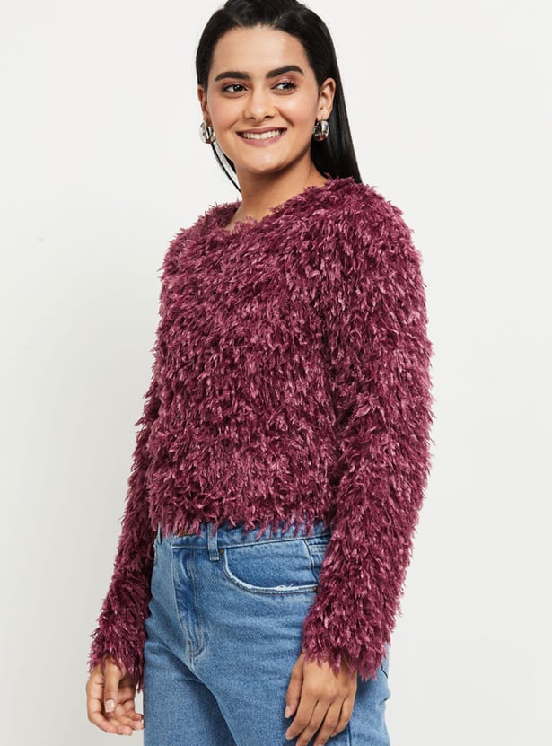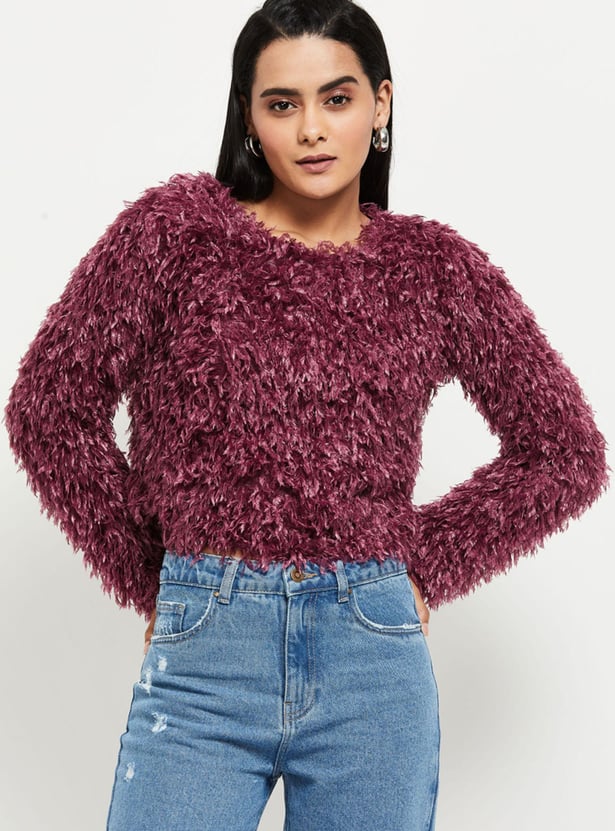 Shaggy texture brings a cosy, stylish look to this crop sweater featuring a round neckline and long sleeves.