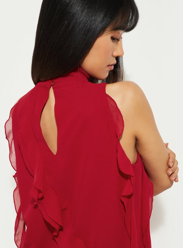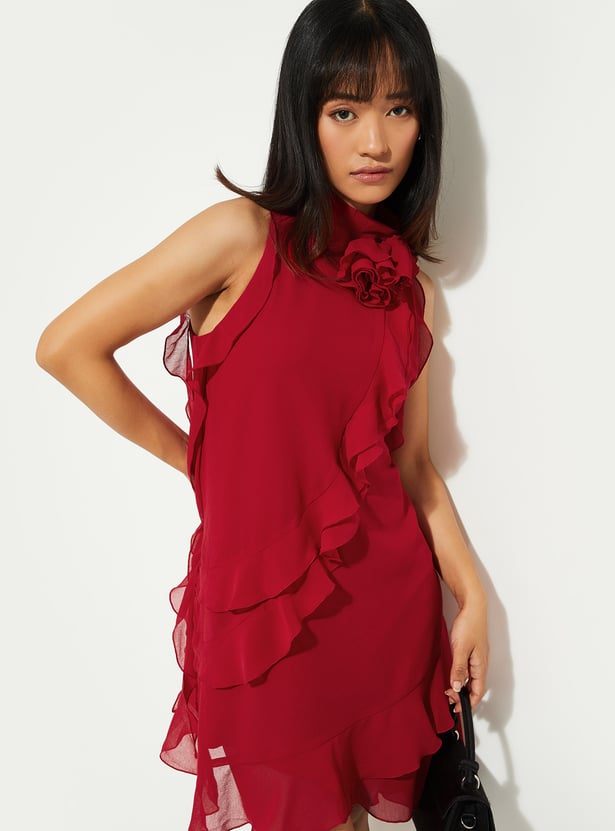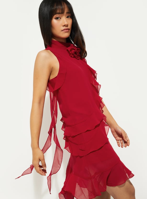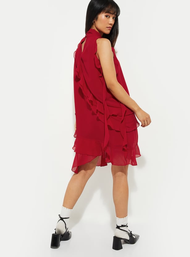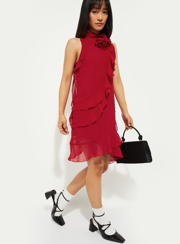 This ruffled dress combines elegance and modern style. Featuring a sleeveless design, high neck, and knee-length cut, its straight silhouette is complemented by the playful ruffle detailing.