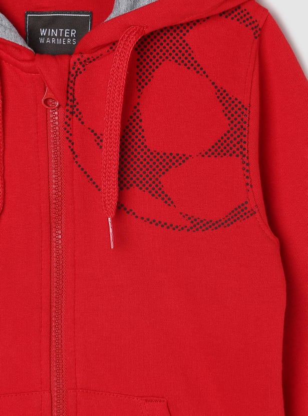 Keep your kids stylish and warm in this sweatshirt while they step out to play during the winter. It flaunts a graphic printed surface, a hooded neckline, and full sleeves. The best way to make his outfit stand out is to team it up with a pair of jeans and lace-up shoes.