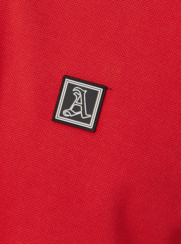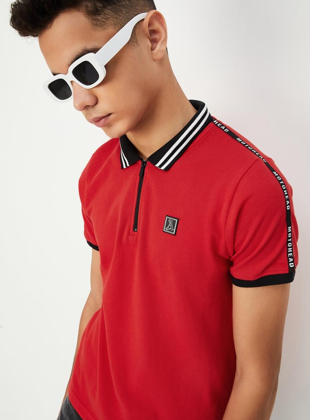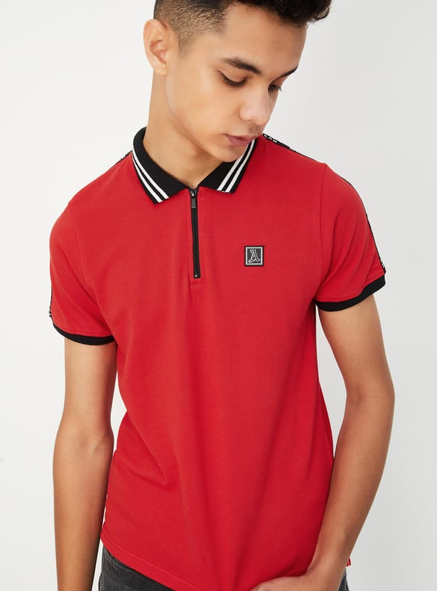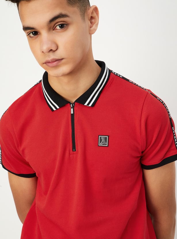 Smarten his style with this T-shirt rendered in a solid tone. It has a polo collar, short sleeves, taping on the shoulders, ribbed cuffs, and a step hem.