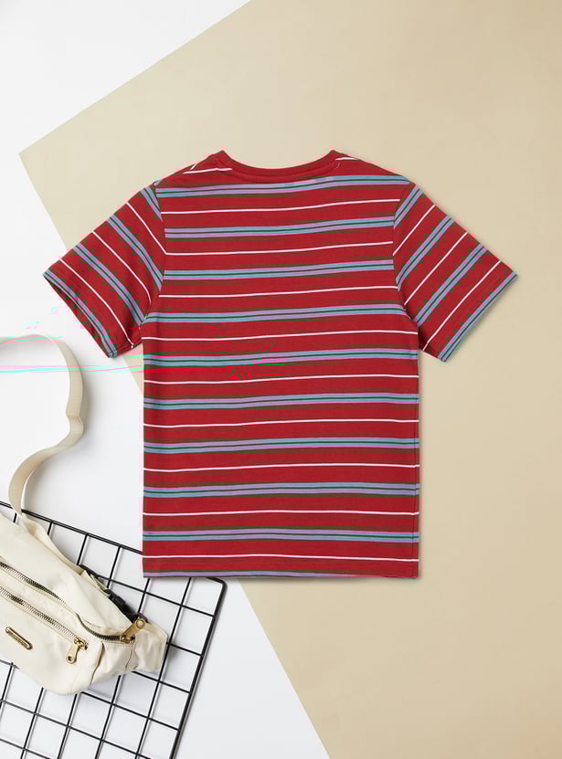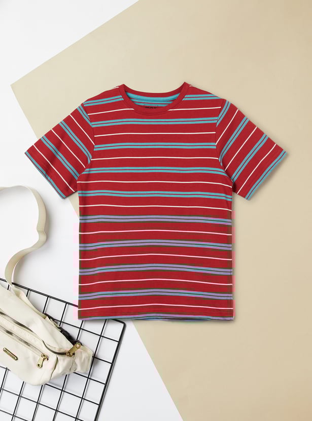 Classic and versatile, this striped t-shirt is styled with a crew neck and half sleeves, offering breathable comfort and a timeless design. The stripes add a touch of casual charm, making it a go-to piece for everyday wear.