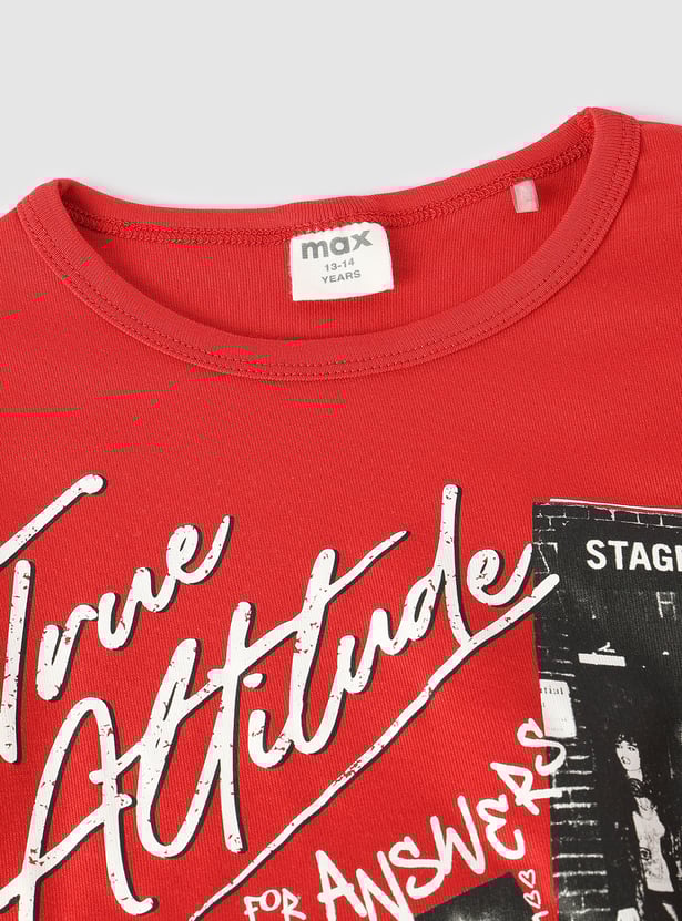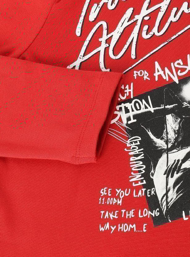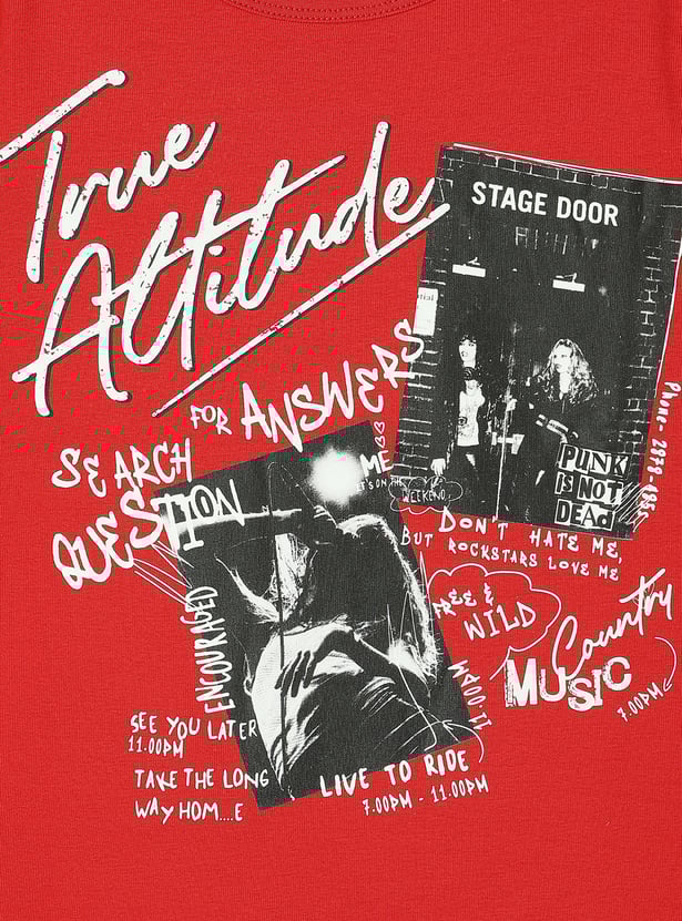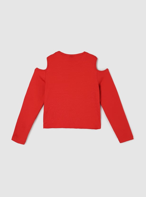 She'll nail the fun, fashionable look with this T-shirt. The cold shoulders add a dramatic flair. This tee is styled with a round neck, full sleeves, crop profile, and graphic prints.