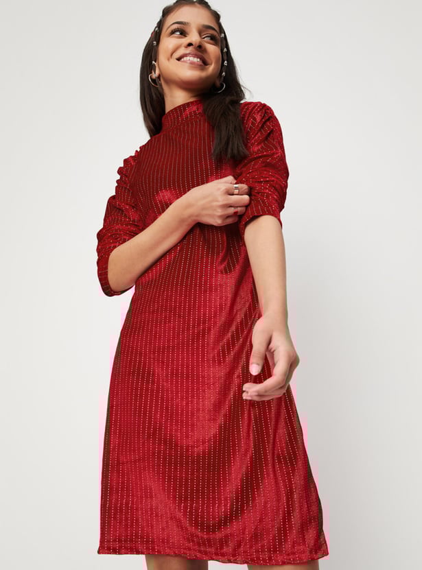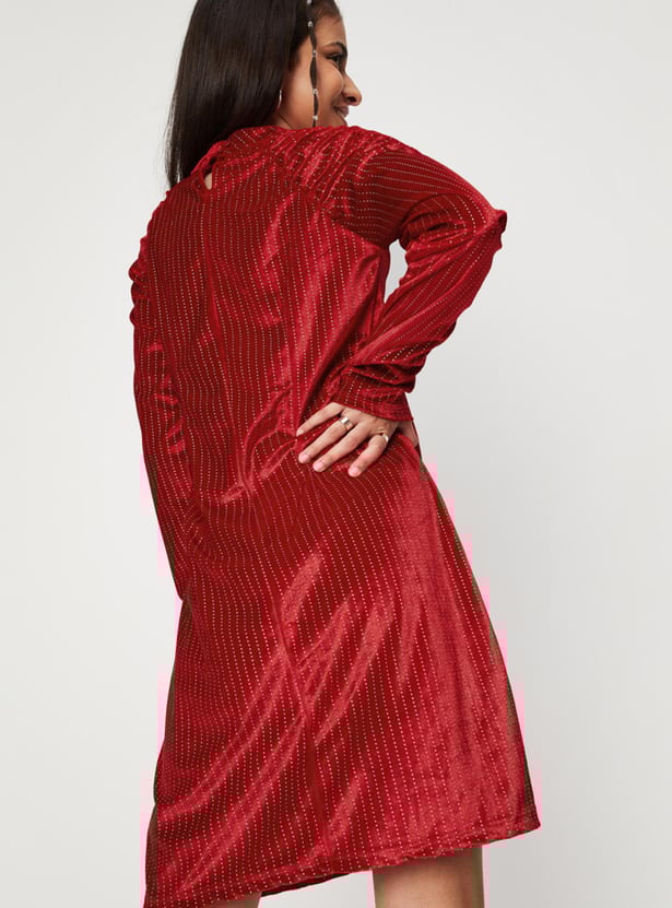 Add versatility to your little one's basic look with this A-line dress designed with an embellished surface, high neckline, full sleeves, and button closure.