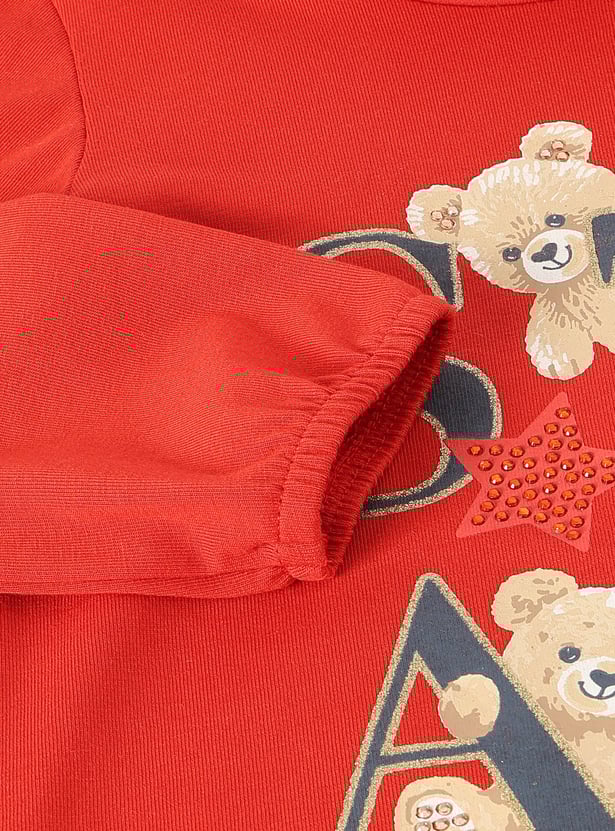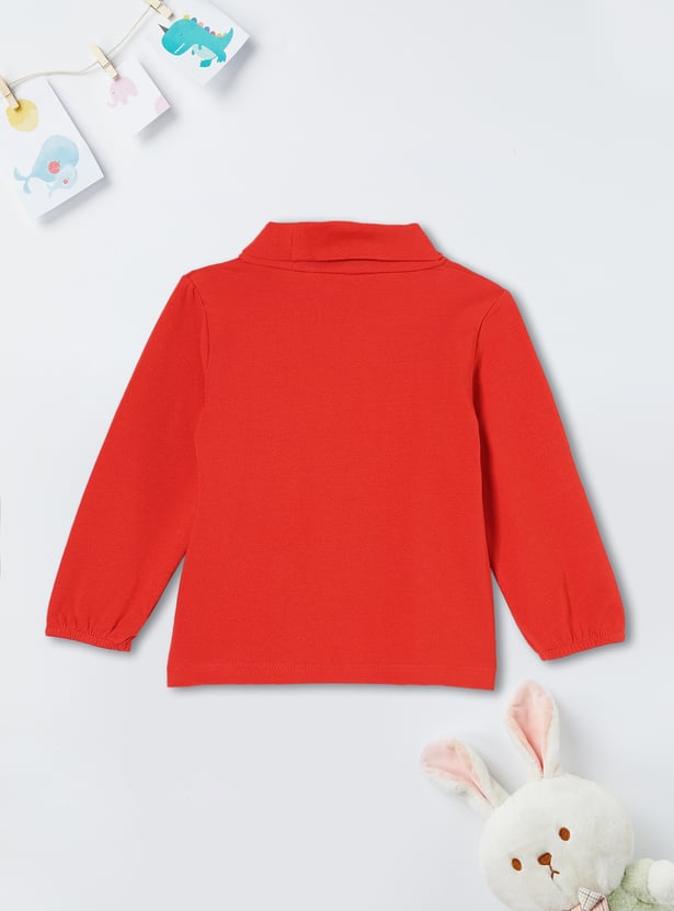 Add a fun twist to your kid's casual wardrobe with this stylish T-shirt. Featuring a playful graphic print with eye-catching embellishments, it’s designed with a cosy turtle neck and full sleeves to keep them warm and comfortable.