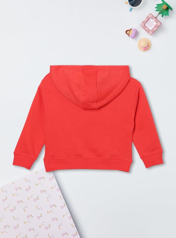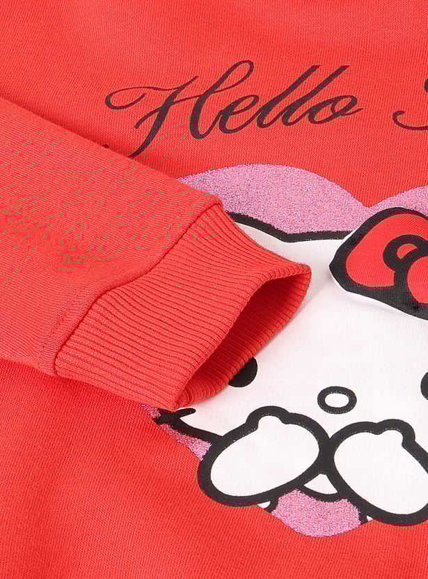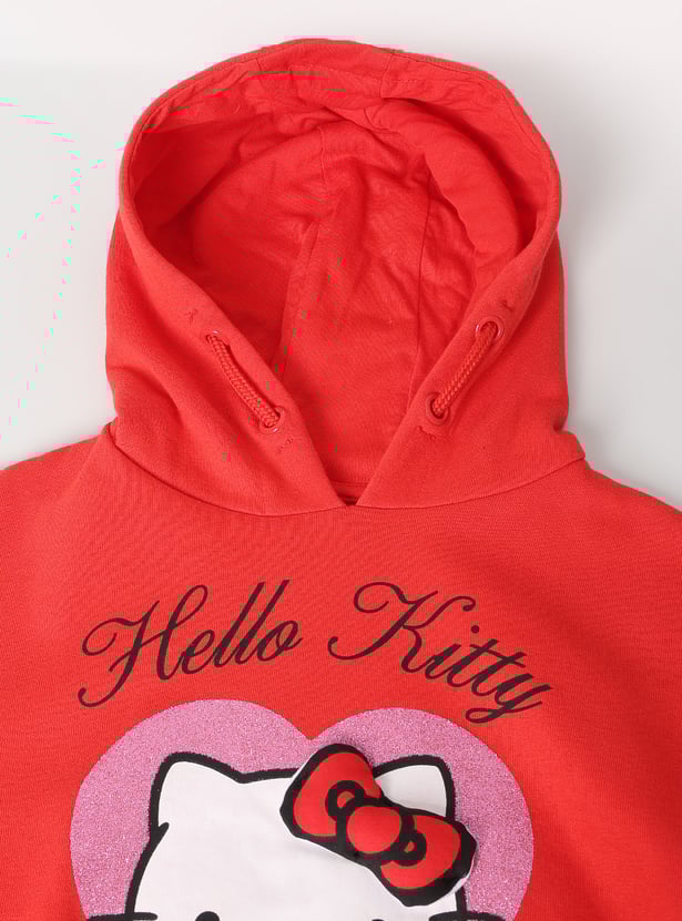 This girls’ Hello Kitty sweatshirt features a playful shimmer detail that adds a hint of sparkle to your little one's casual look. Designed with a hood, full sleeves, and ribbed hems, it’s both cosy and stylish for everyday wear.