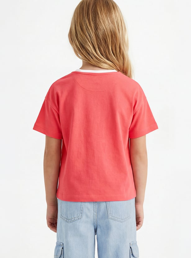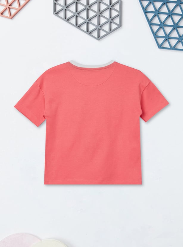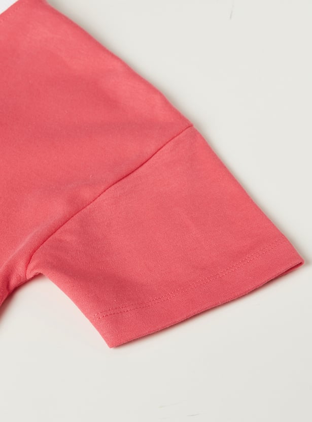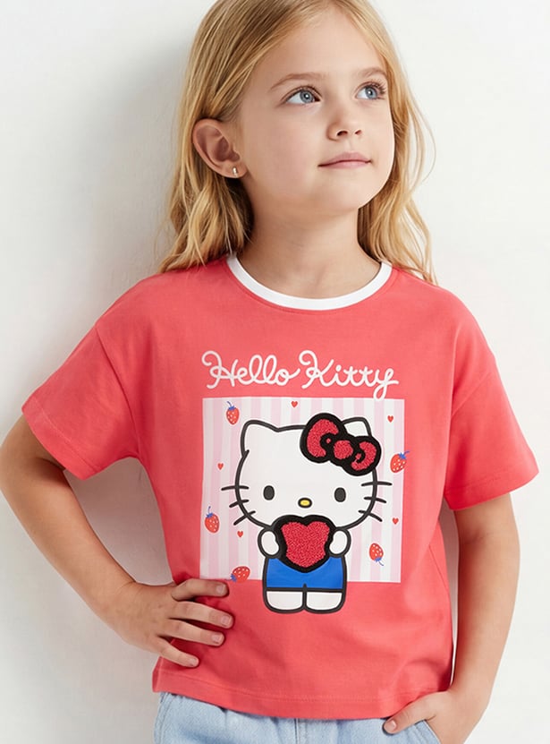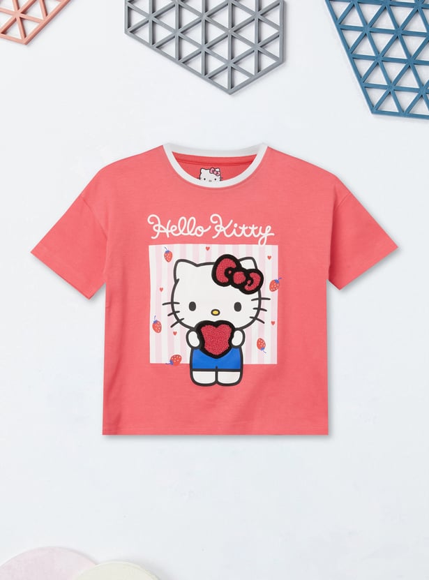 Add a touch of playful charm with this Hello Kitty print T-shirt, featuring a round neckline, and half sleeves for everyday comfort and style.