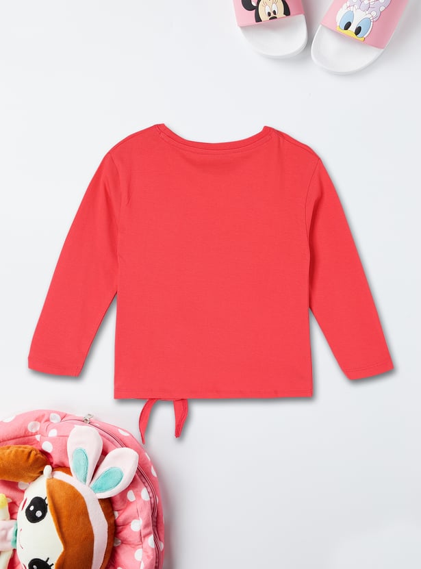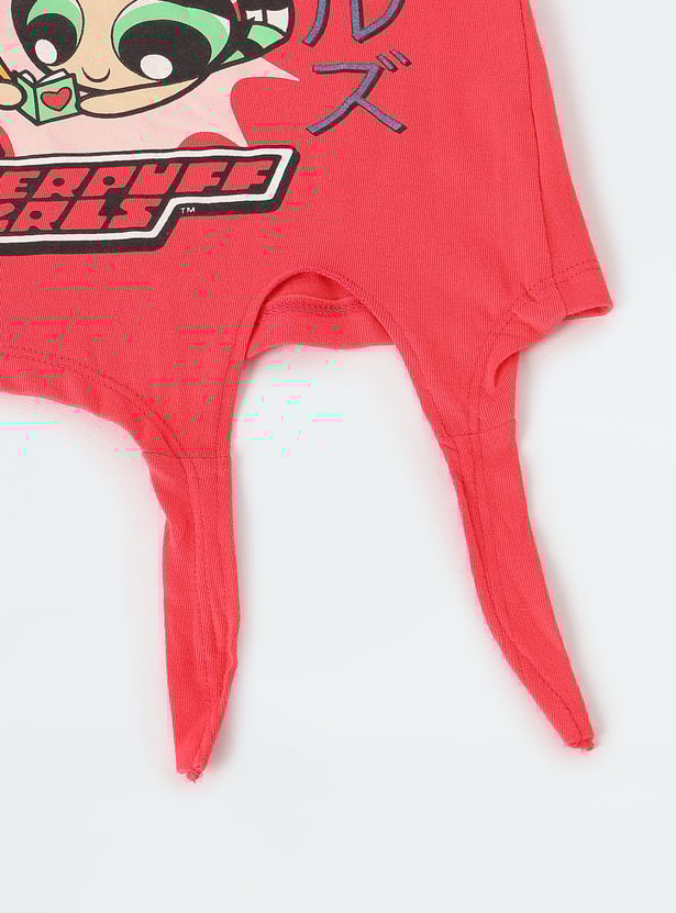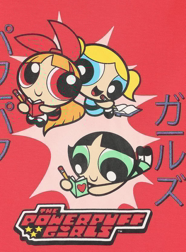 Spruce up your little one's wardrobe with this adorable T-shirt. Featuring a classic round neck, playful Powerpuff Girls print, full sleeves, and a trendy knotted hem, it’s the perfect addition to add a fun and stylish twist to their everyday outfits.