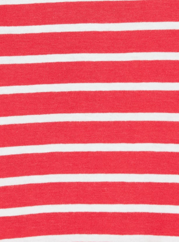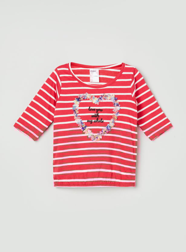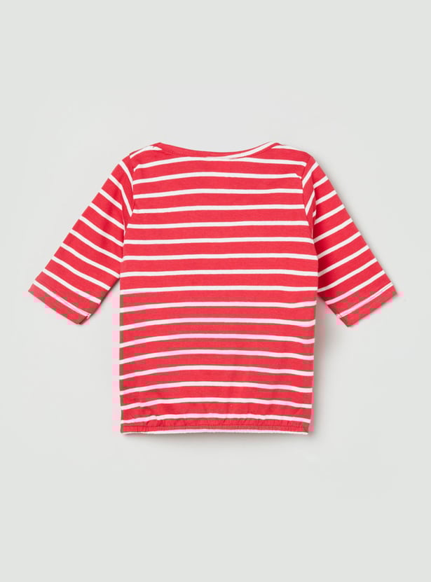 An ideal pick for a casual wardrobe, this trendy t-shirt is designed with bold stripes, three-quarter sleeves and a round neckline.