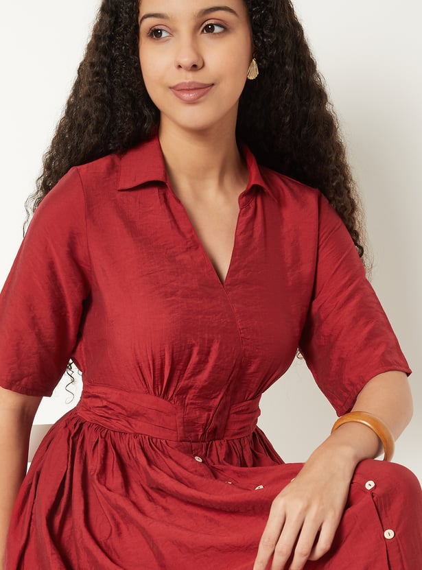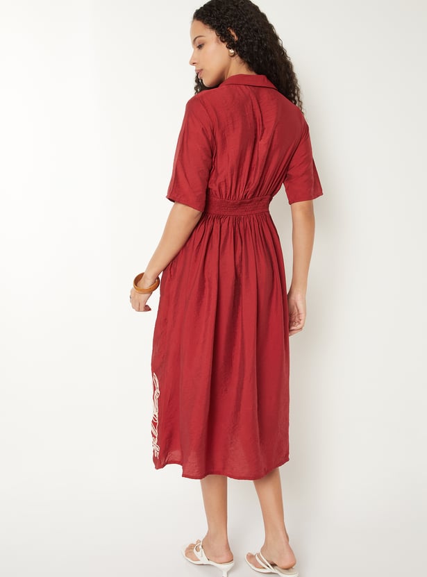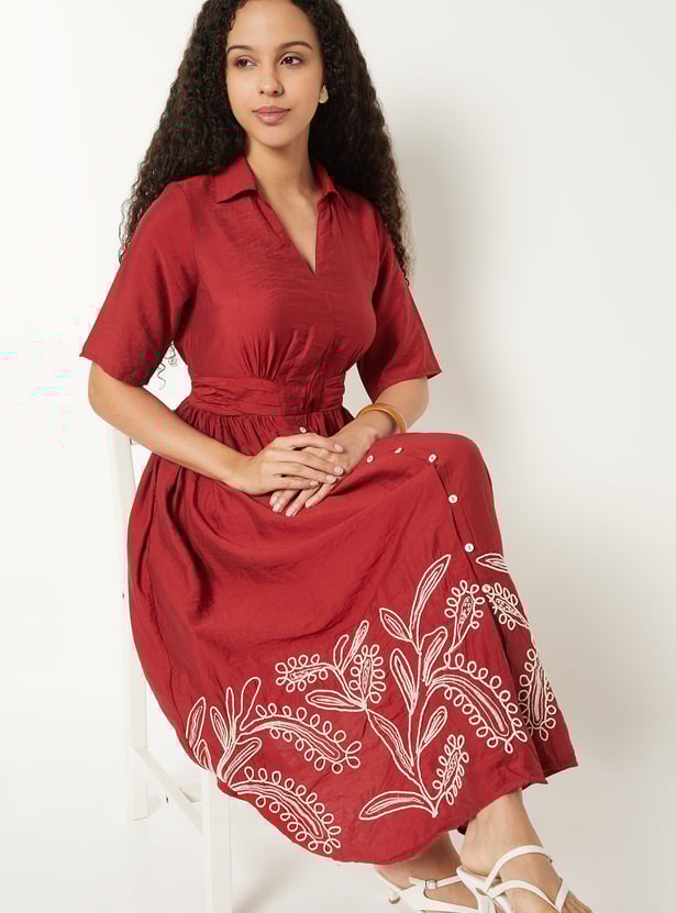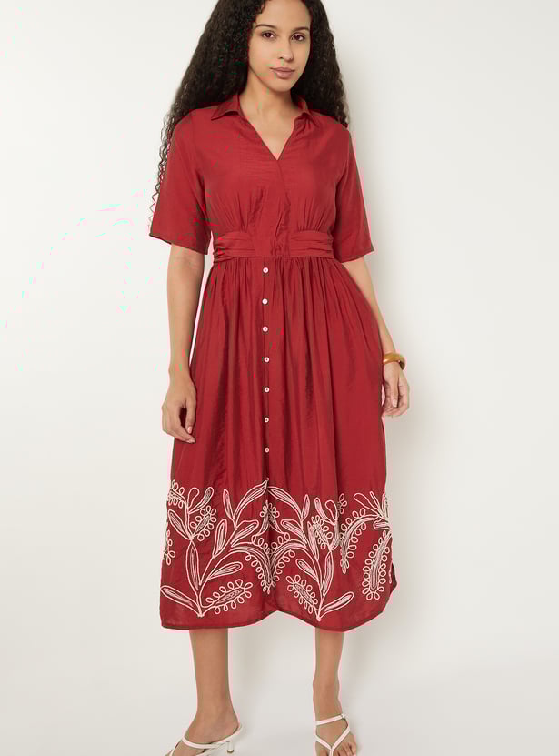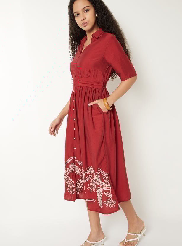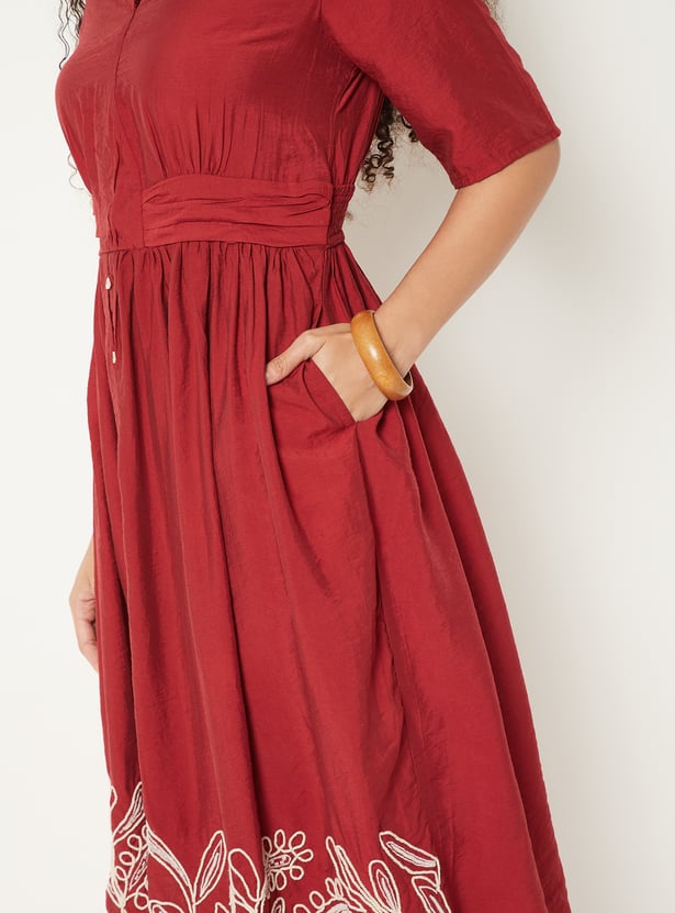Bring charm to your wardrobe with this embroidered midi dress, featuring a smart collared neckline, breezy half sleeves, and practical side pockets. Its elegant embroidery adds a refined touch to a classic silhouette.