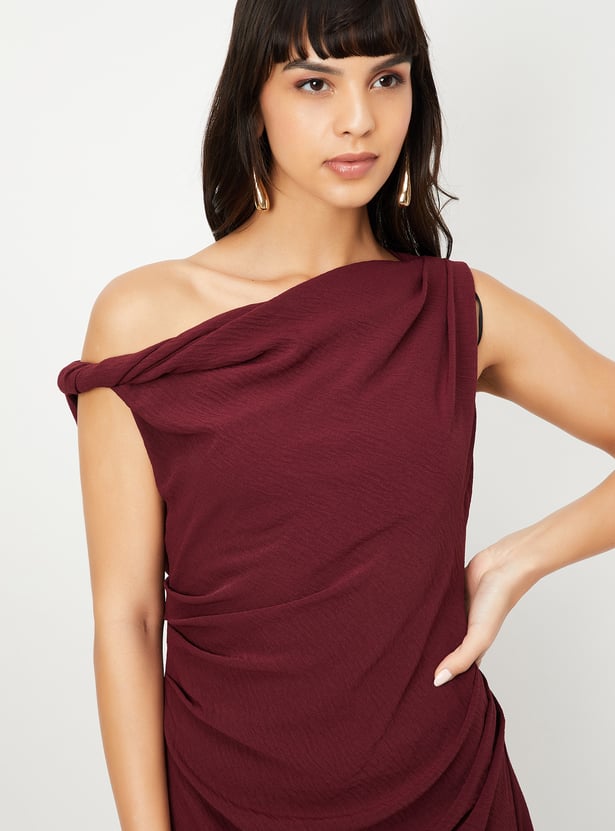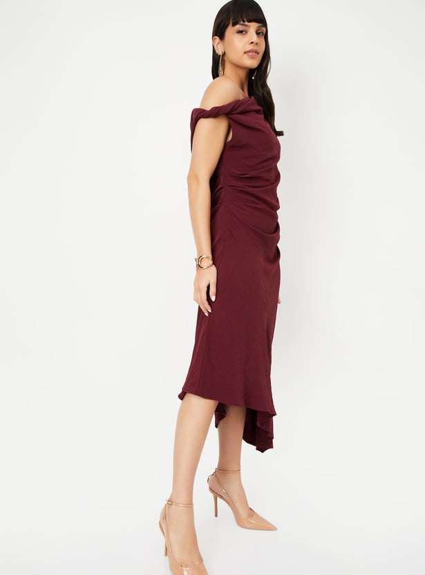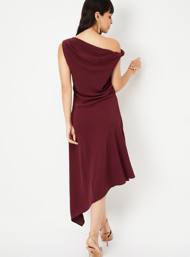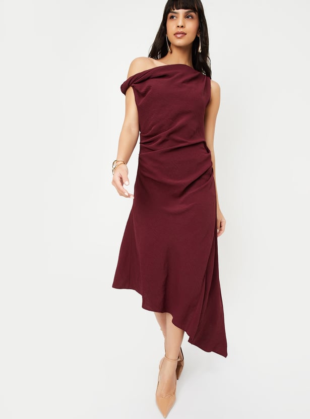 Make a statement in this one-shoulder dress with gathers, featuring an asymmetrical hemline and a flattering midi length. Perfect for a chic evening out or a special occasion, it offers a bold yet elegant look.