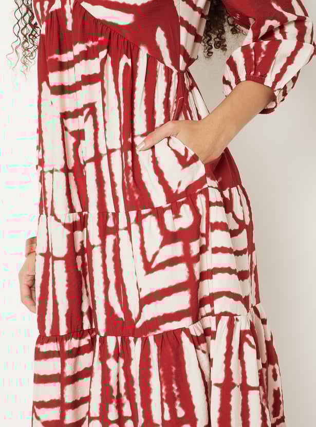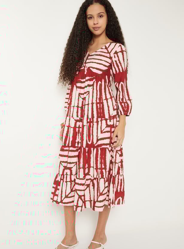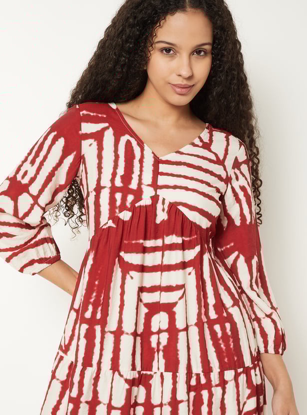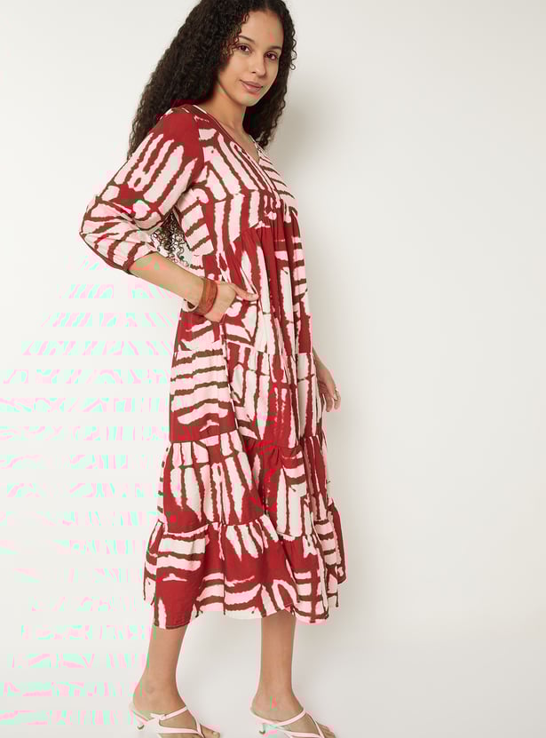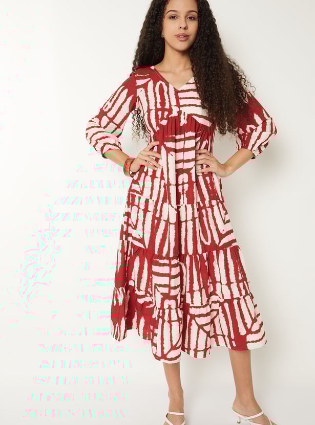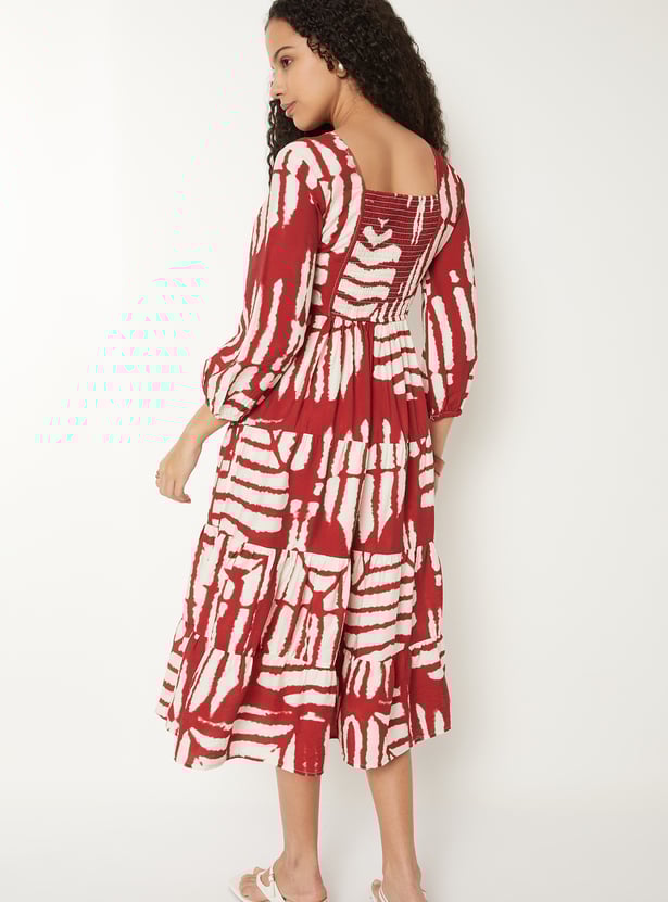 Elevate your everyday style with this printed dress. Featuring a v neck, it comes with 3/4th sleeves and a flattering midi length. The addition of a smocked back brings charm to the silhouette.