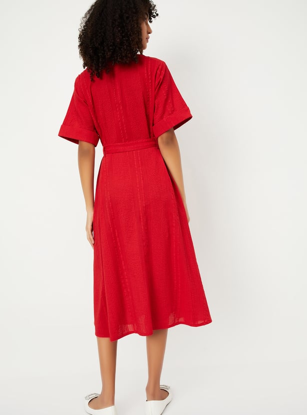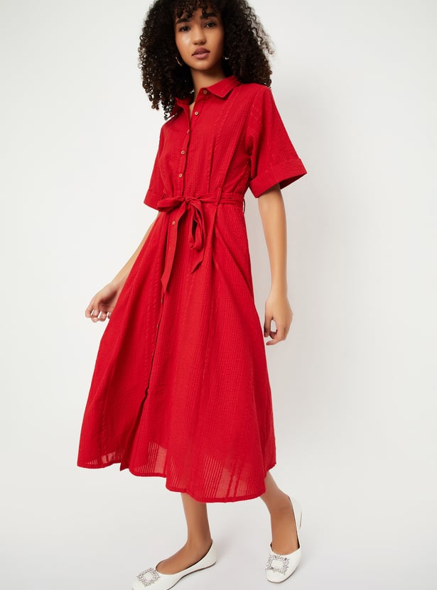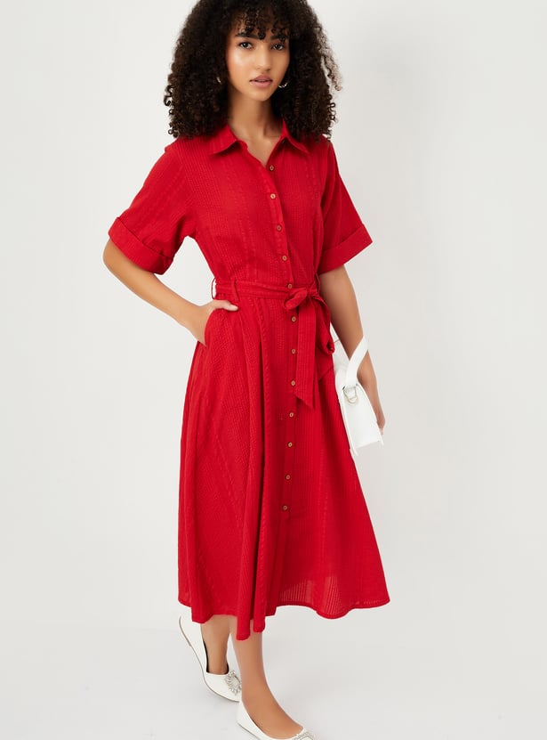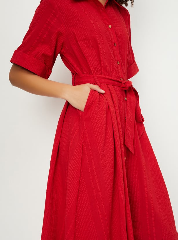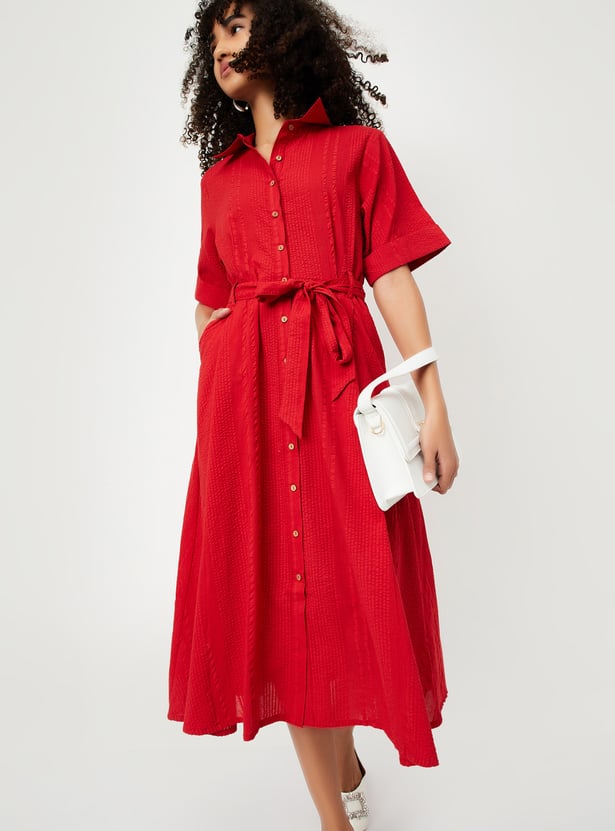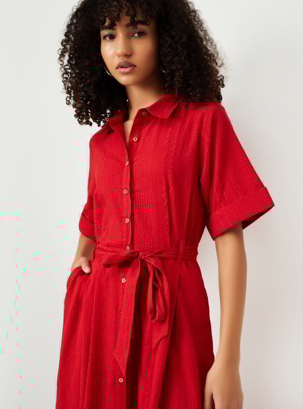 This textured midi dress brings effortless style with its spread collar, button placket, and half sleeves. Designed with a flattering silhouette, it features a belted waist and side pockets for a casual, functional touch.
