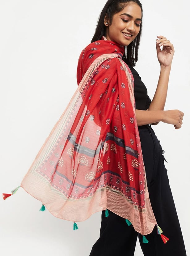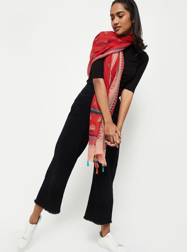 Flaunt a stylish look with this elegantly printed scarf, which is detailed with a tasseled border.