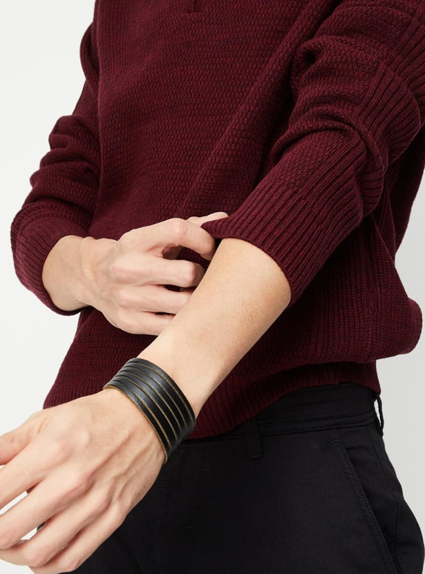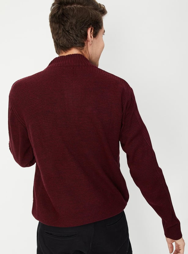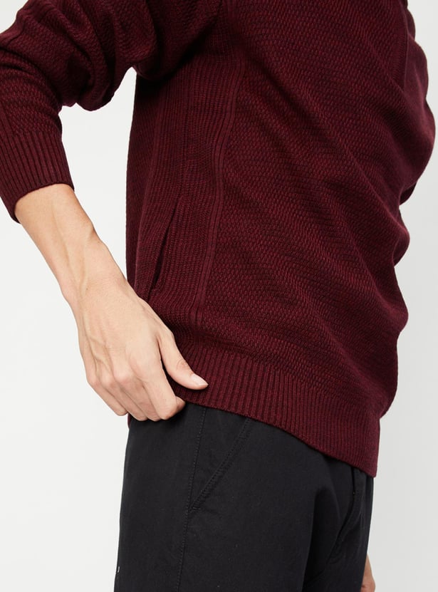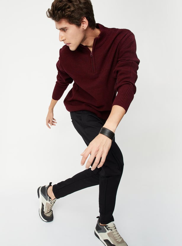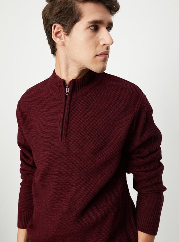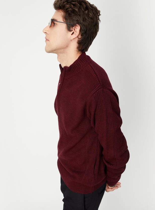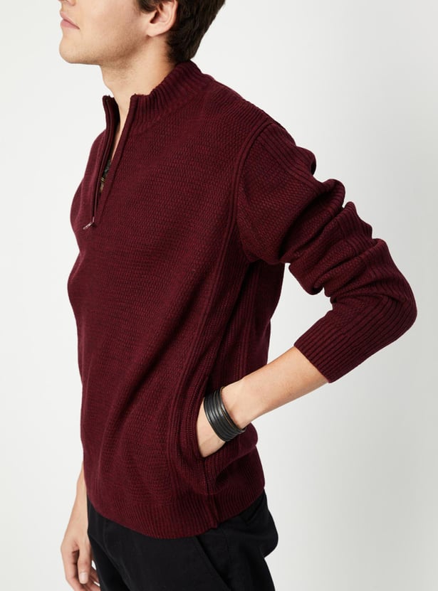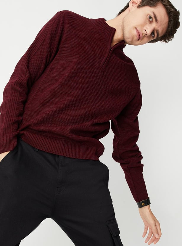 Beat the winter blues in style in this sweater featuring a textured finish and a ribbed pattern. It showcases a high-neck, quarter zip closure, long sleeves, and waist pockets. Layer this sweater over a tee and style it with cargo pants and sneakers for a cosy look.