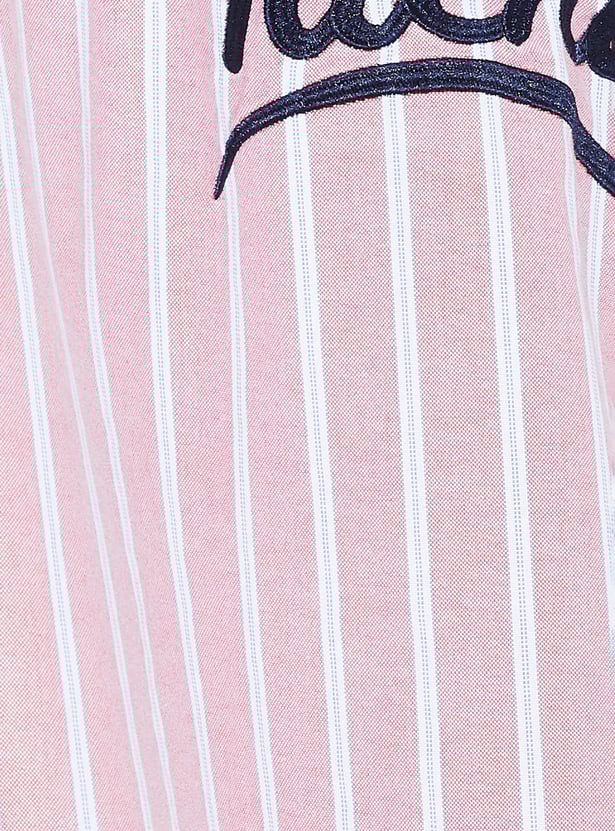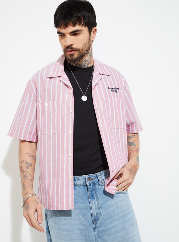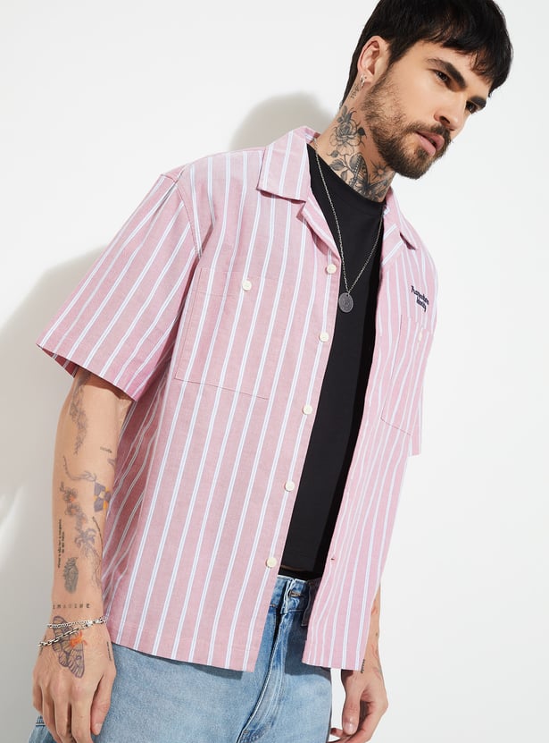 Step into effortless style with this striped oversized shirt, where relaxed tailoring meets modern charm. Featuring a breezy resort collar, button placket, patch pockets, and easy half sleeves, it’s designed for comfort with a bold edge.