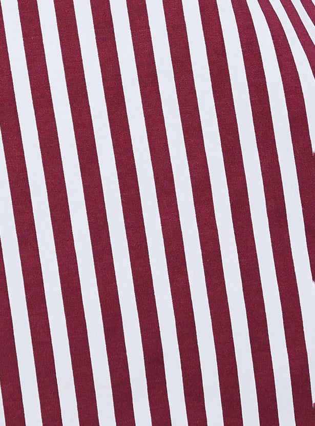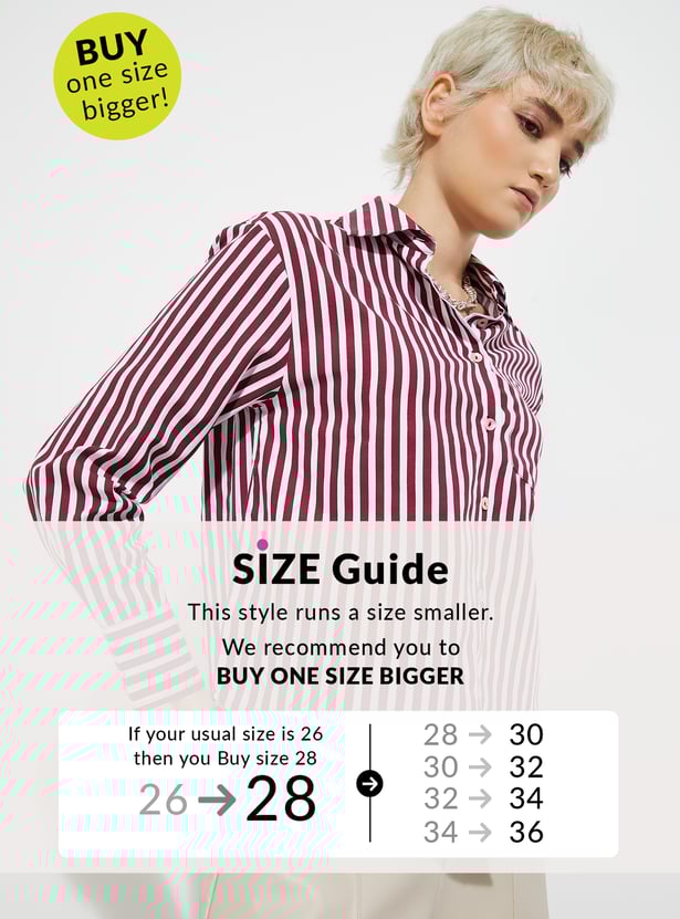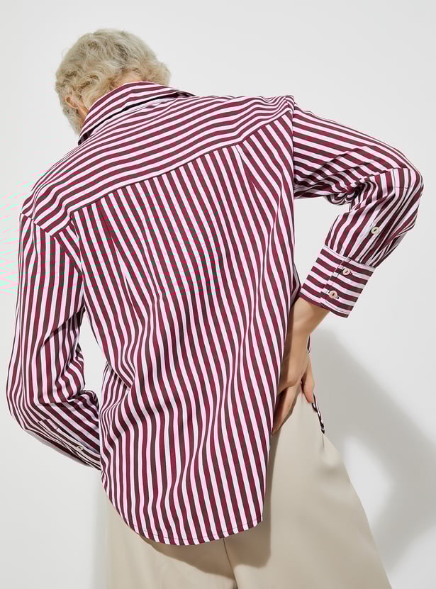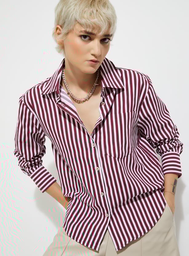This striped oversized shirt features a spread collar, button placket, patch pocket, and full sleeves with button cuffs for a relaxed, effortless vibe. The bold stripes add a timeless touch to its easy silhouette.