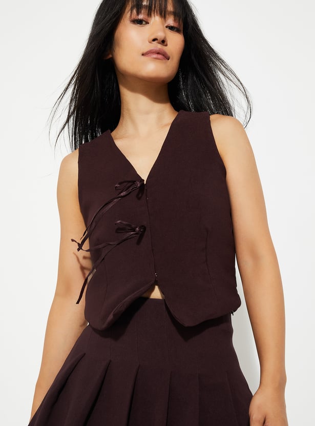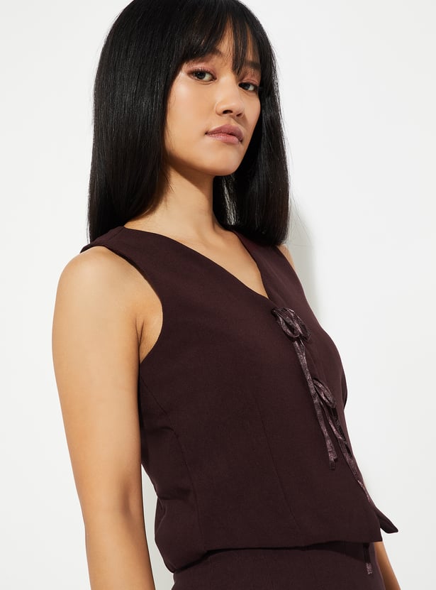 Add a touch of sophistication to your outfit with this textured waistcoat, featuring a v-neck, sleeveless design, and a tie-up closure. Its refined texture and modern cut make it a stylish layering piece for any occasion.