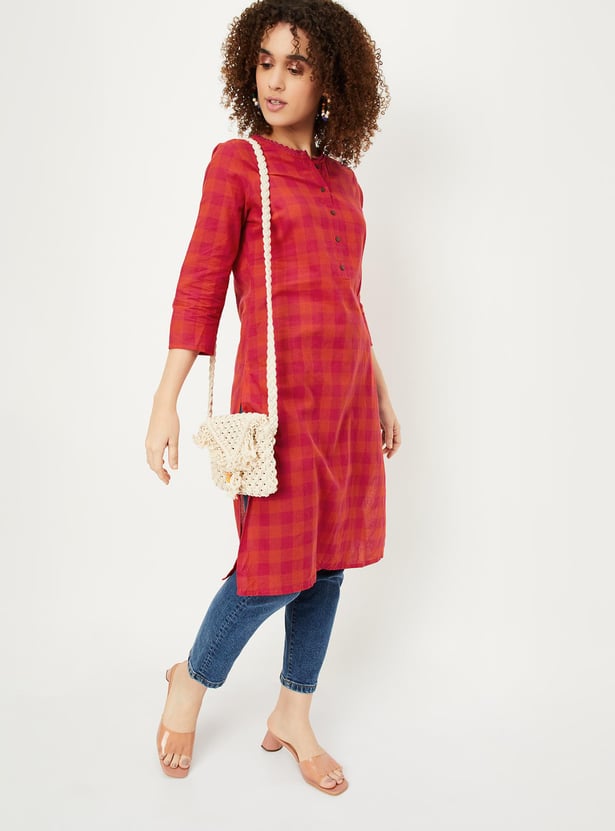 Indulge in refined ethnic fashion with this enchanting kurta. Showcasing a round neck with dainty lace detail, a button placket on the front, and three-fourth sleeves, it seamlessly combines comfort and style. The straight knee-length cut, regular fit, and checkered pattern make it an ultimate choice for achieving a trendy look with ease.