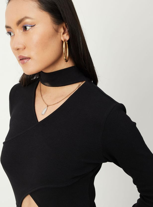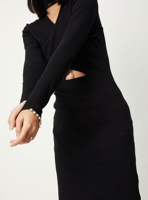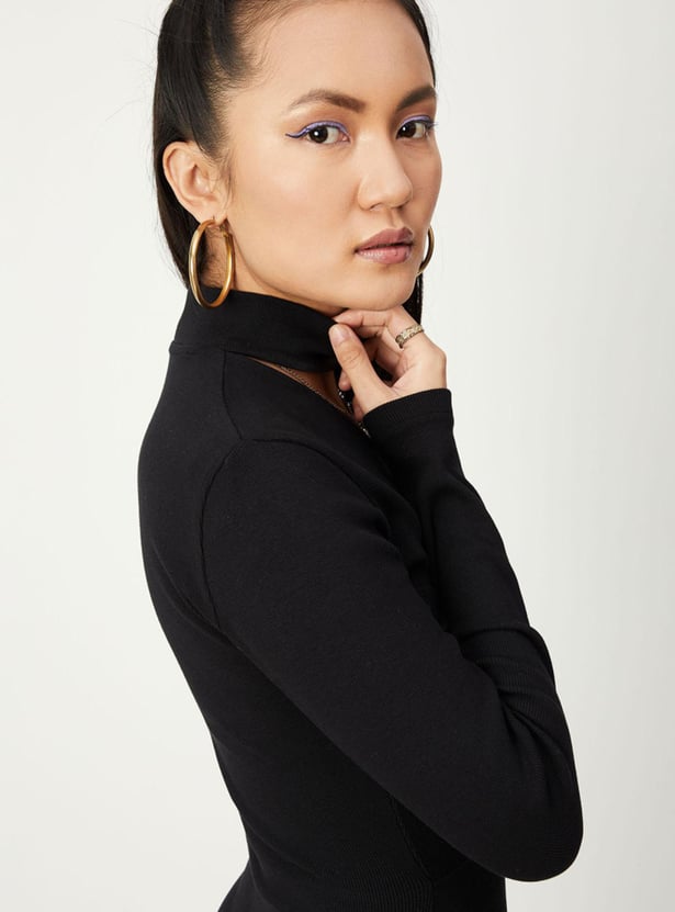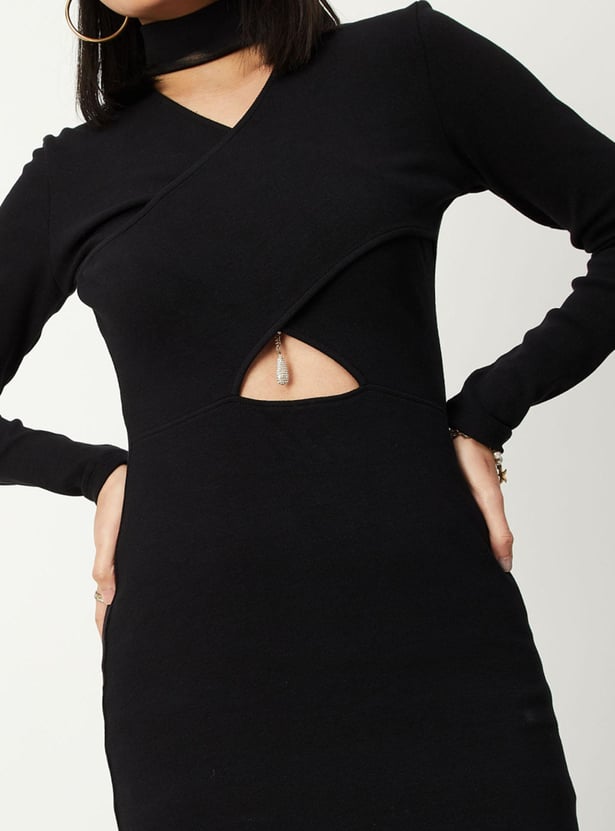 Turn heads in this dress which is designed in a mini-profile with a choker neckline, cut-out at the waist, and long sleeves. The solid tone and a bodycon silhouette lend a flattering look. high neckline, full sleeves, and a mini construction. Complete the statement-making look by pairing this dress with boots and a sling bag.
