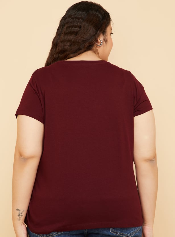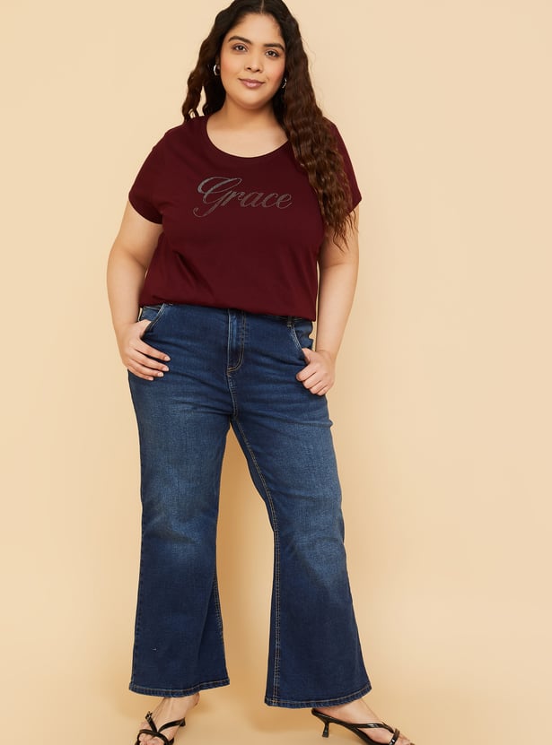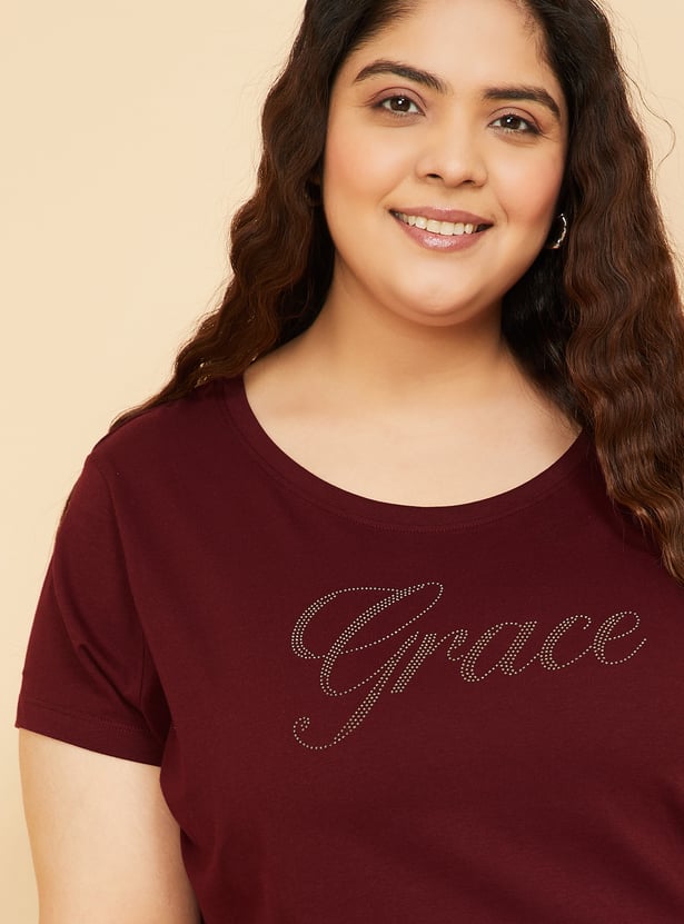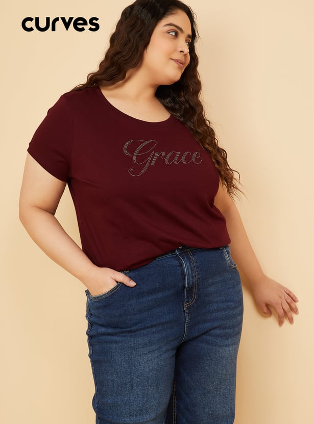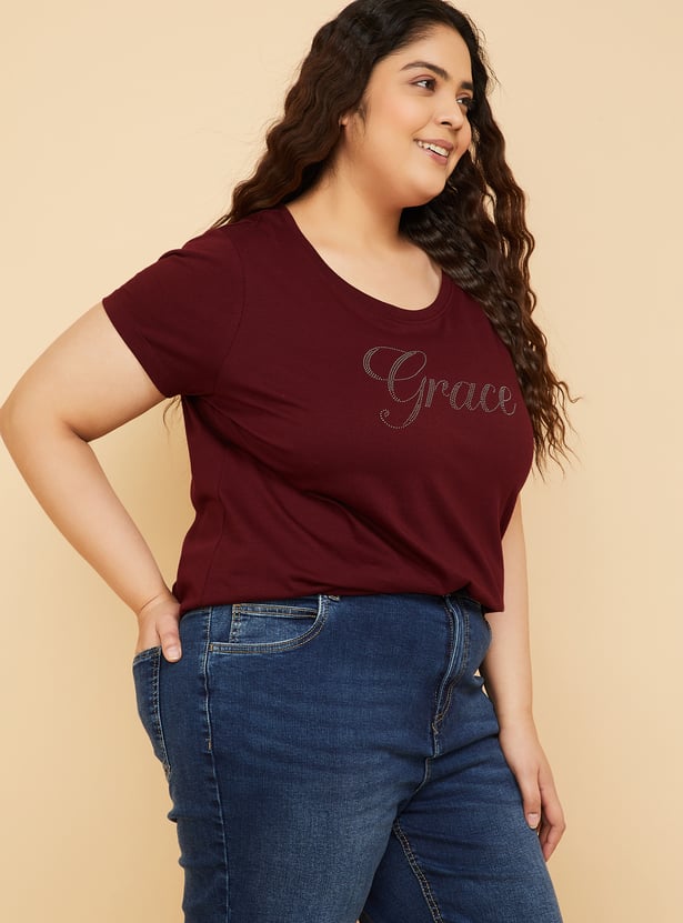 Elevate your basics with this embellished T-shirt, designed to add a touch of sparkle to your everyday style. Featuring a classic round neck and half sleeves, it combines comfort with chic detailing. Model Size :