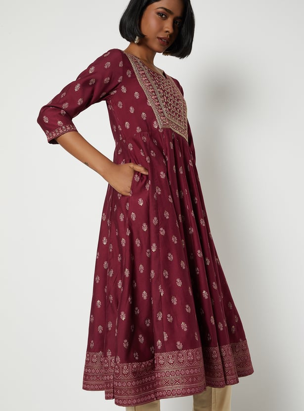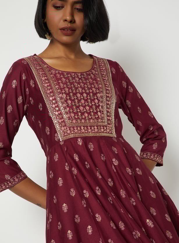 Bring elegance to your everyday style with this embroidered A-line kurta. Designed with a classic round neck, 3/4th sleeves, and a convenient side pocket, it blends comfort with graceful detailing.