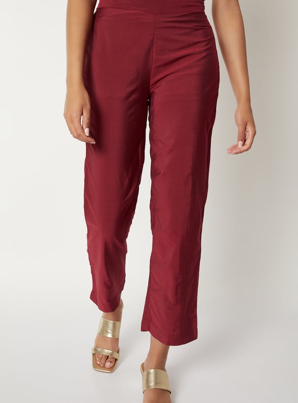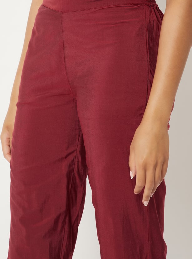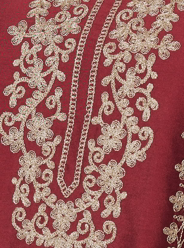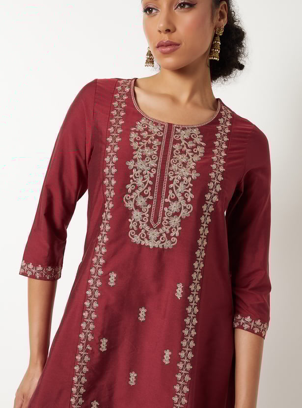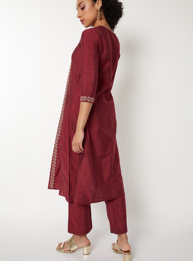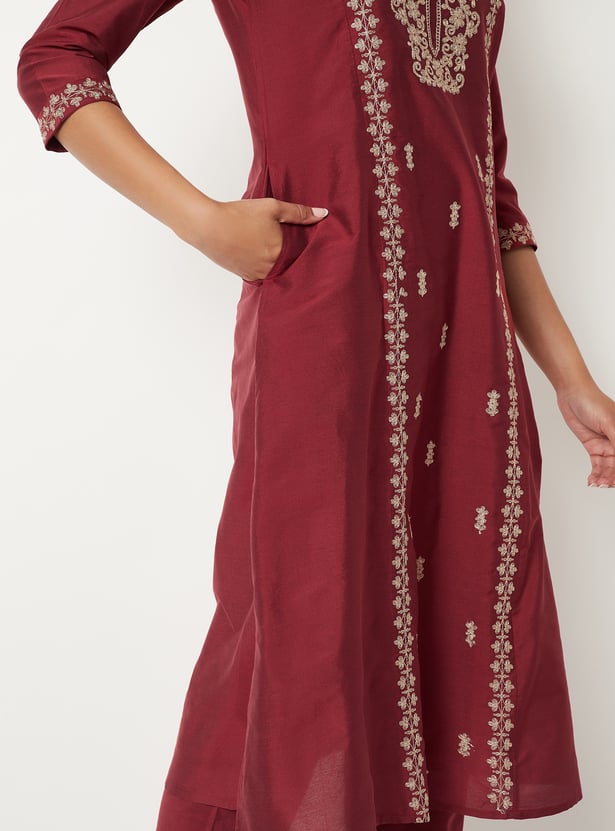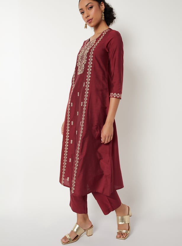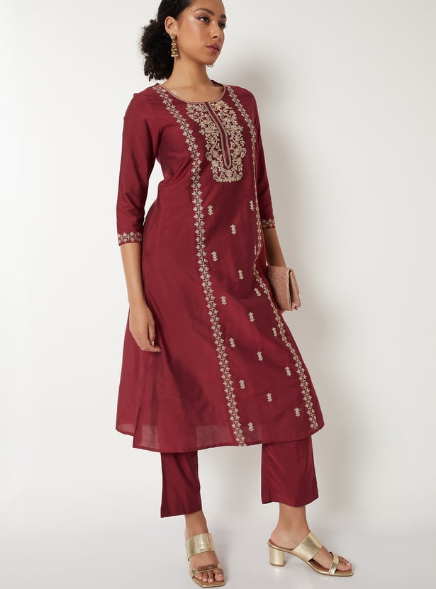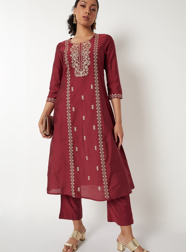 Elegant and easy to wear, this embroidered A-line kurta set blends classic charm with everyday comfort. Featuring a round neck, 3/4th sleeves, and a practical side pocket, it's paired with straight pants designed with an elasticated waist for a flattering, fuss-free fit.