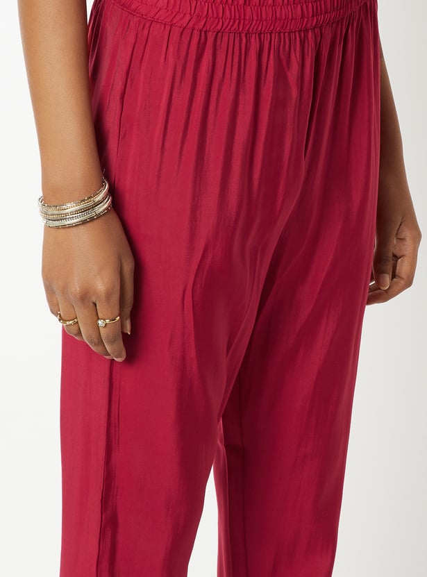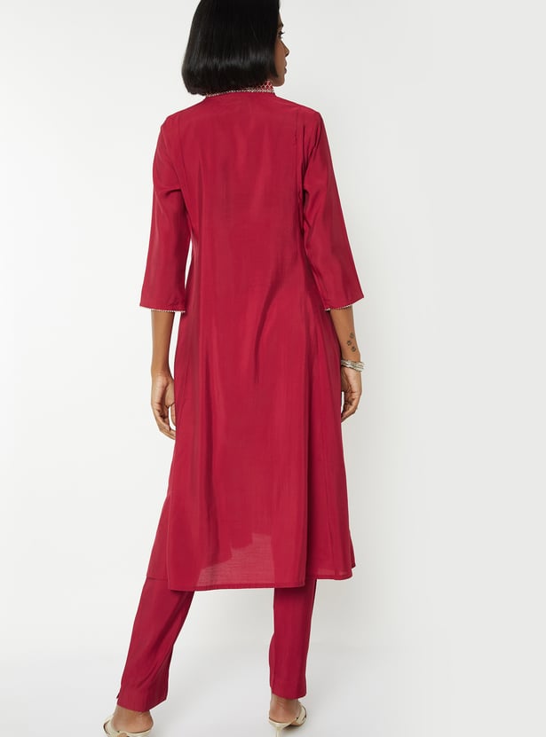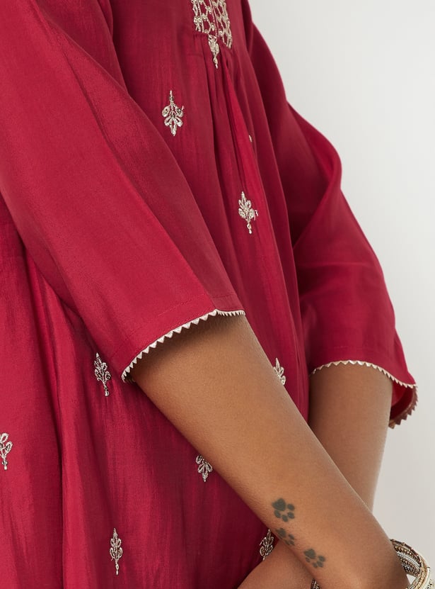Graceful and effortlessly refined, this embroidered A-line kurta set features a flattering stylised neckline and 3/4th sleeves for a timeless silhouette. It’s paired with comfortable straight pants designed with an elasticated waist, offering a perfect blend of style and ease.