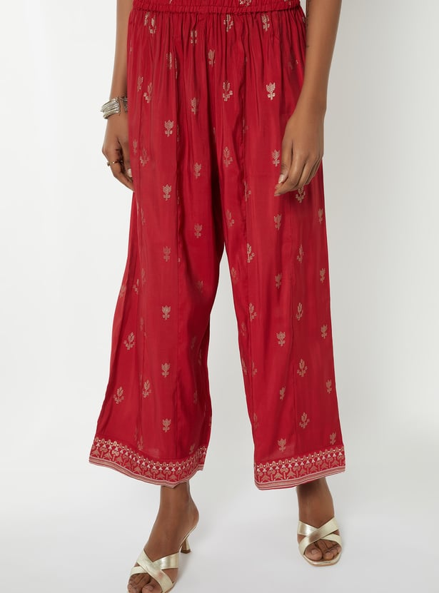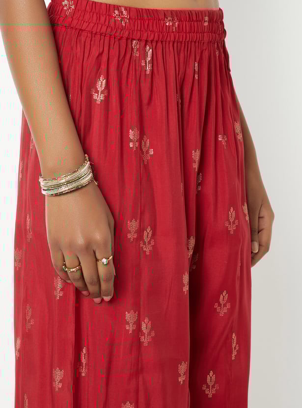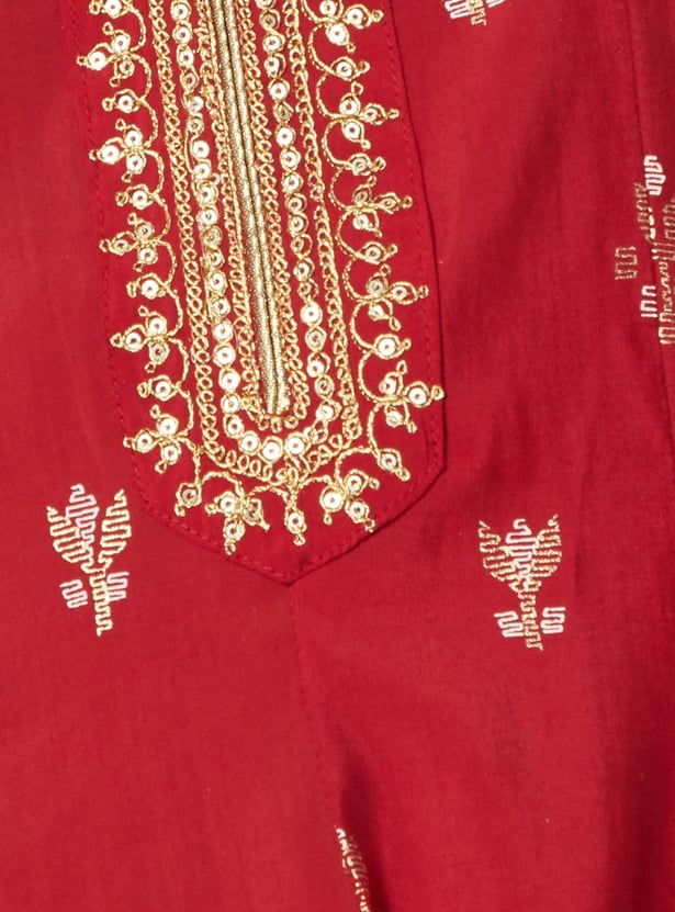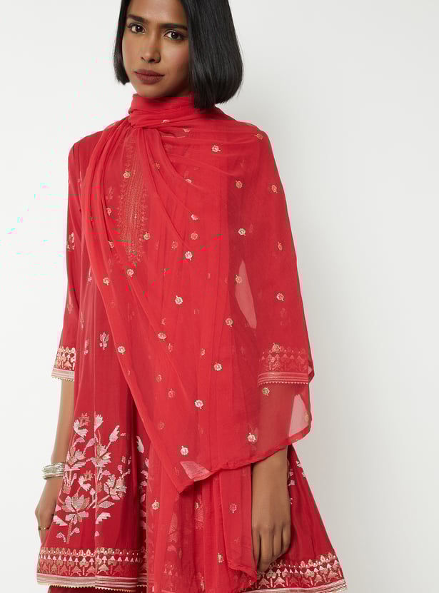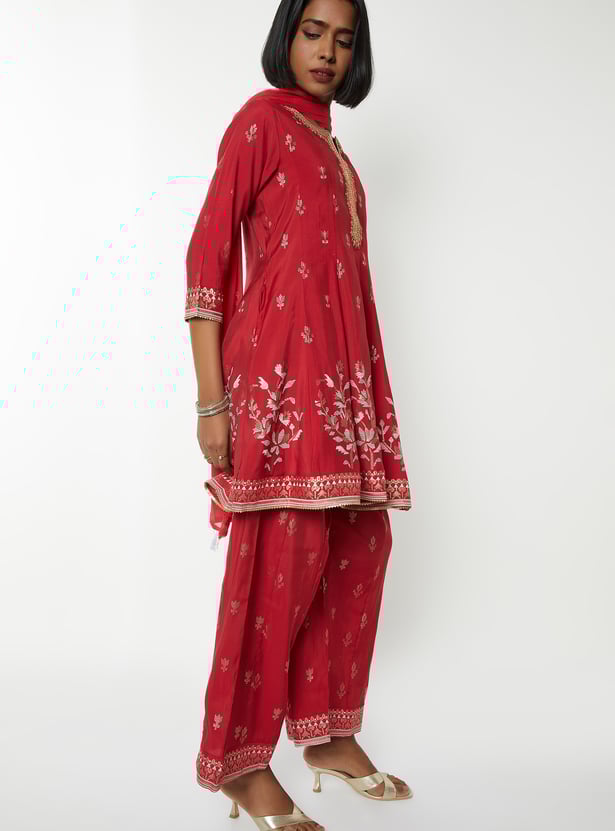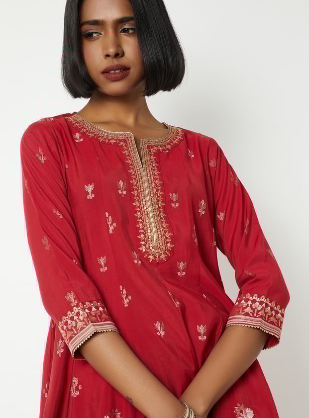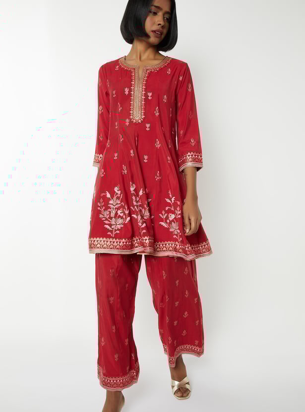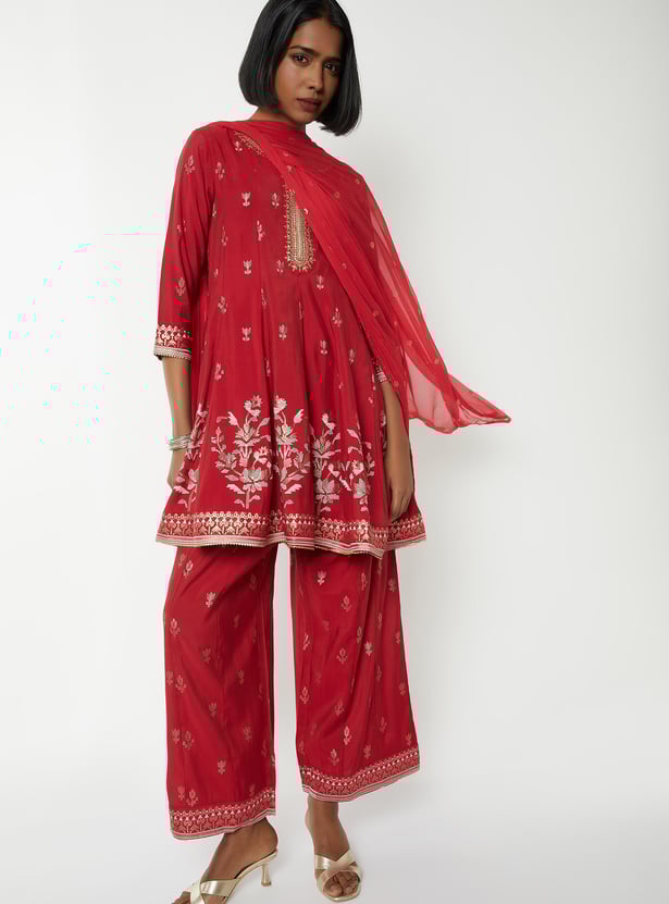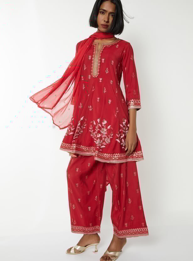 Graceful and versatile, this embroidered A-line kurti set features a kurti with a flattering notch neck and 3/4th sleeves. Paired with easy-fit palazzos with an elasticated waist and a matching dupatta, it’s a complete look that blends comfort with traditional charm.