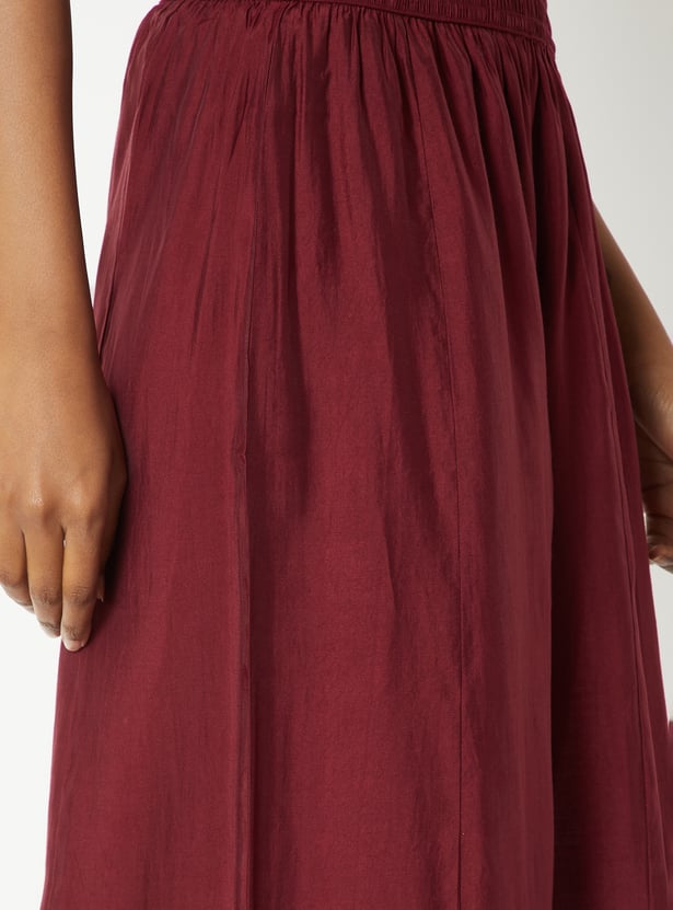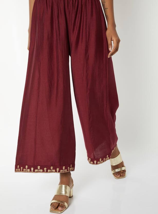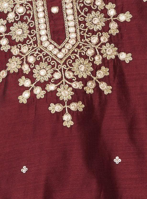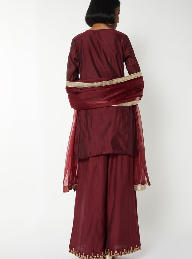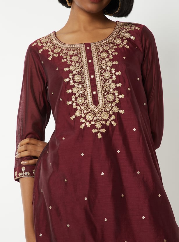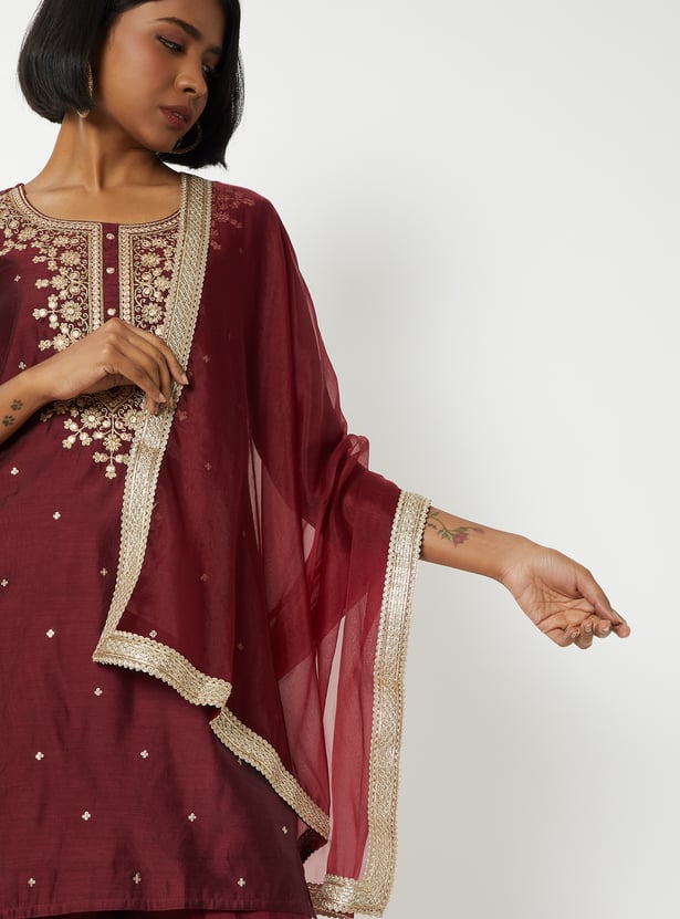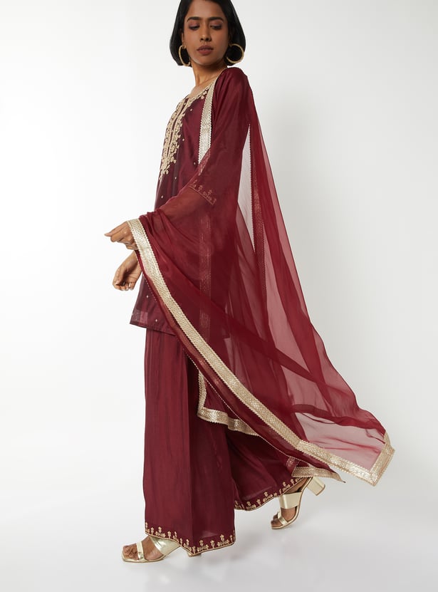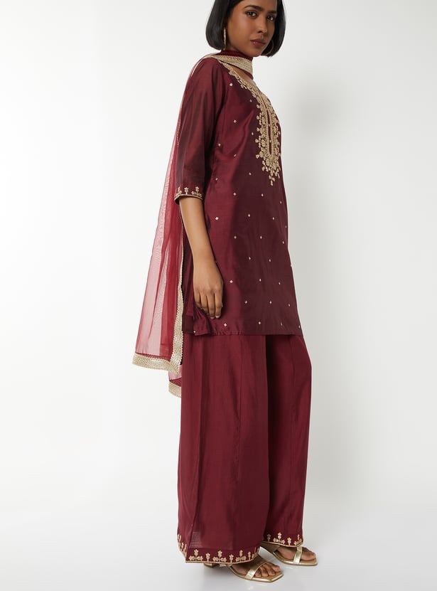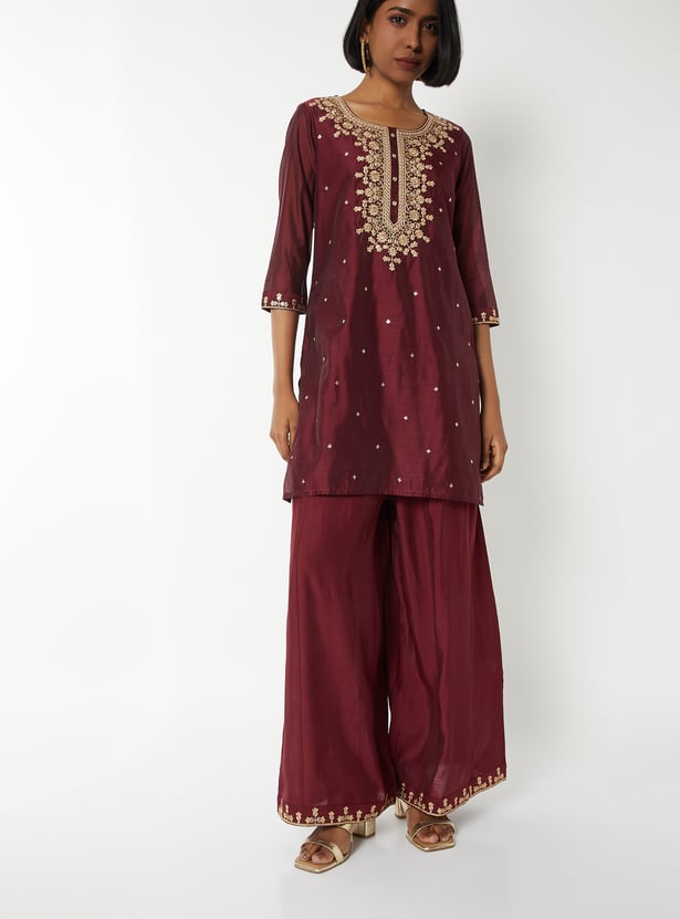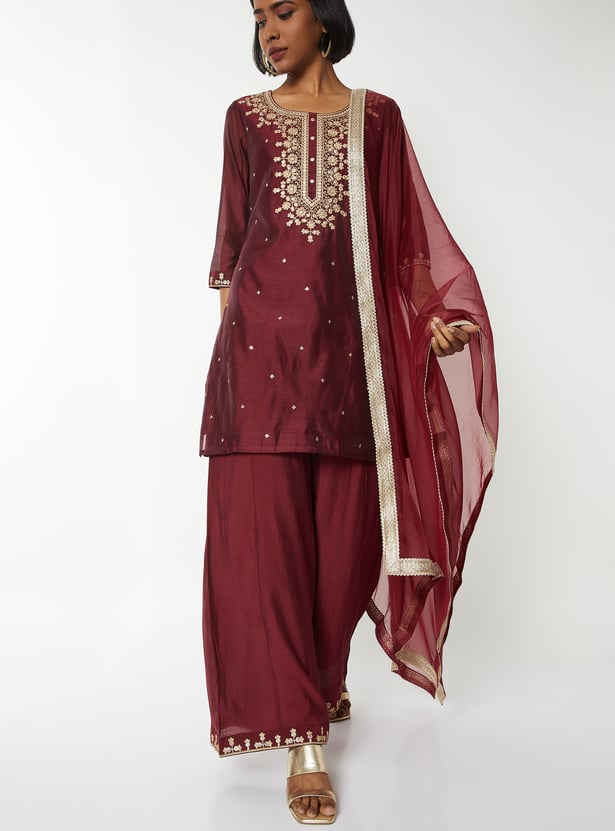 Step out in graceful style with this embroidered straight kurti set. The kurti is designed with a flattering round neck, 3/4th sleeves, and side slits for ease. It comes paired with palazzos featuring an elasticated waist and a matching dupatta for a complete look.
