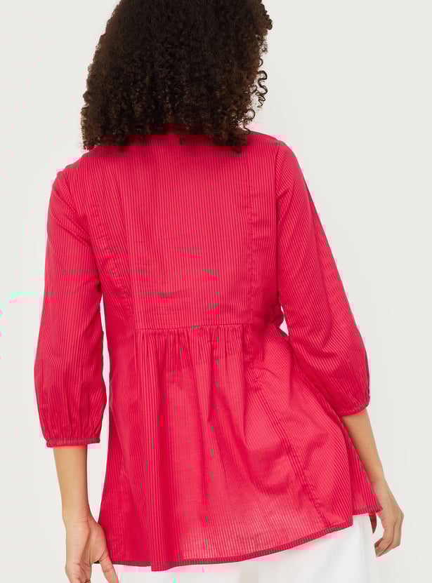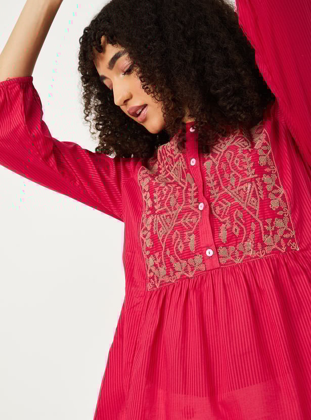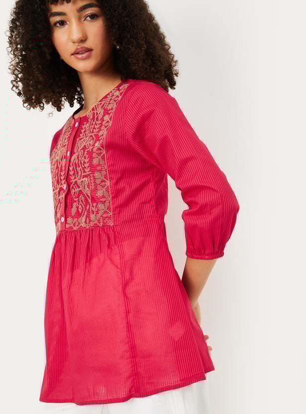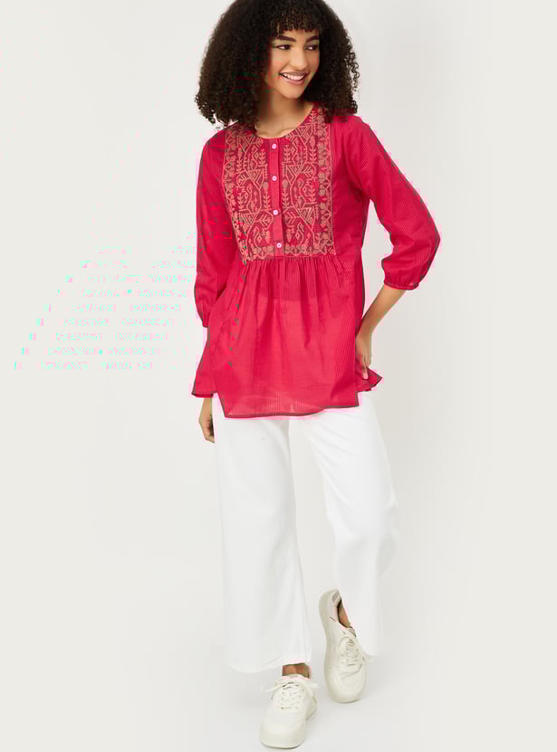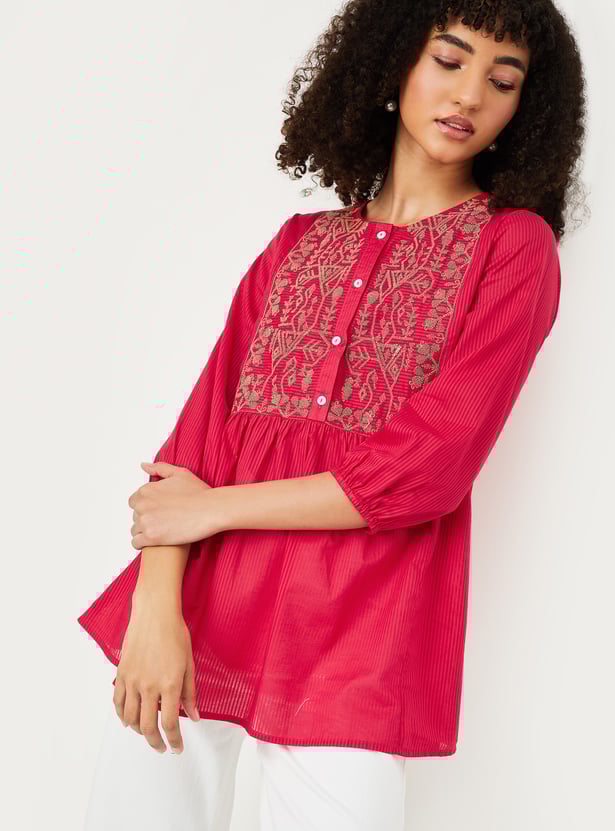 Elevate your everyday look with this embroidered yoke tunic. Featuring a round neckline and three-quarter sleeves, it’s adorned with delicate embroidery at the yoke, adding a touch of elegance to its simple silhouette.