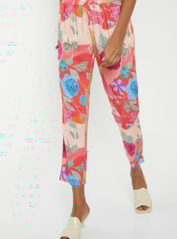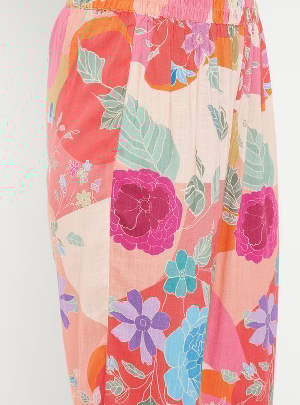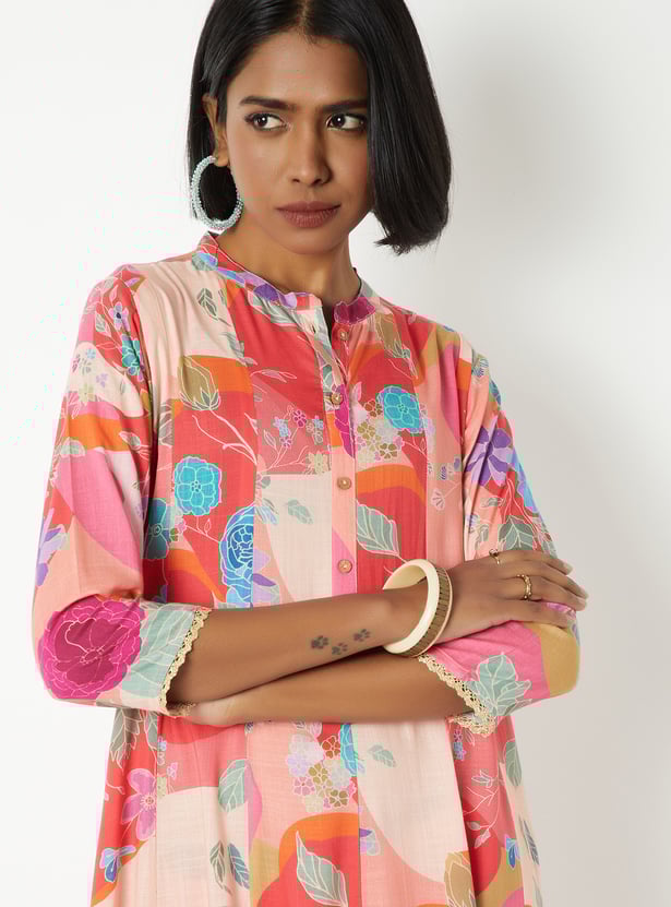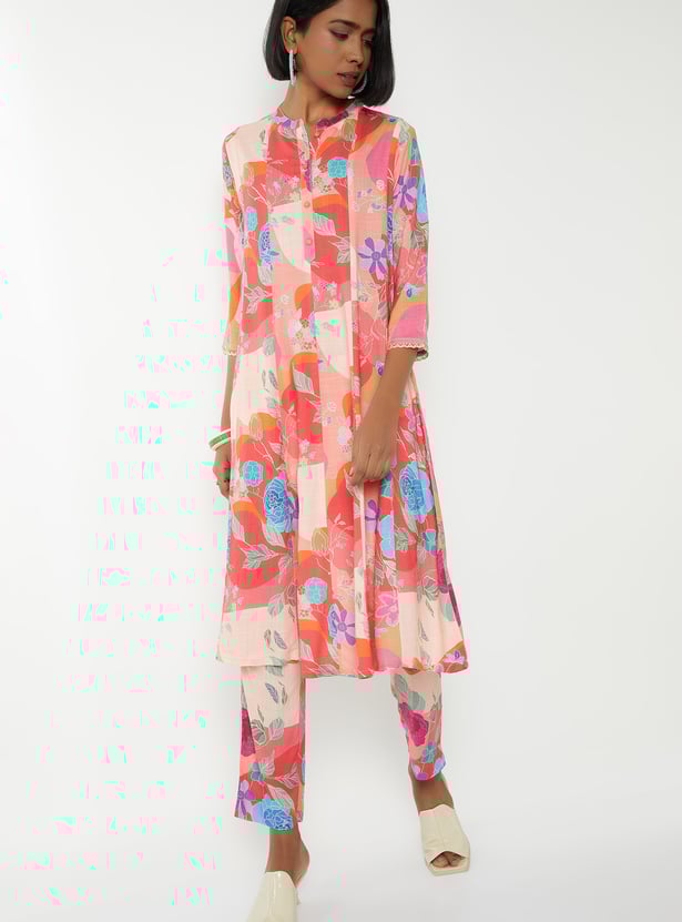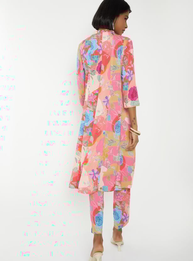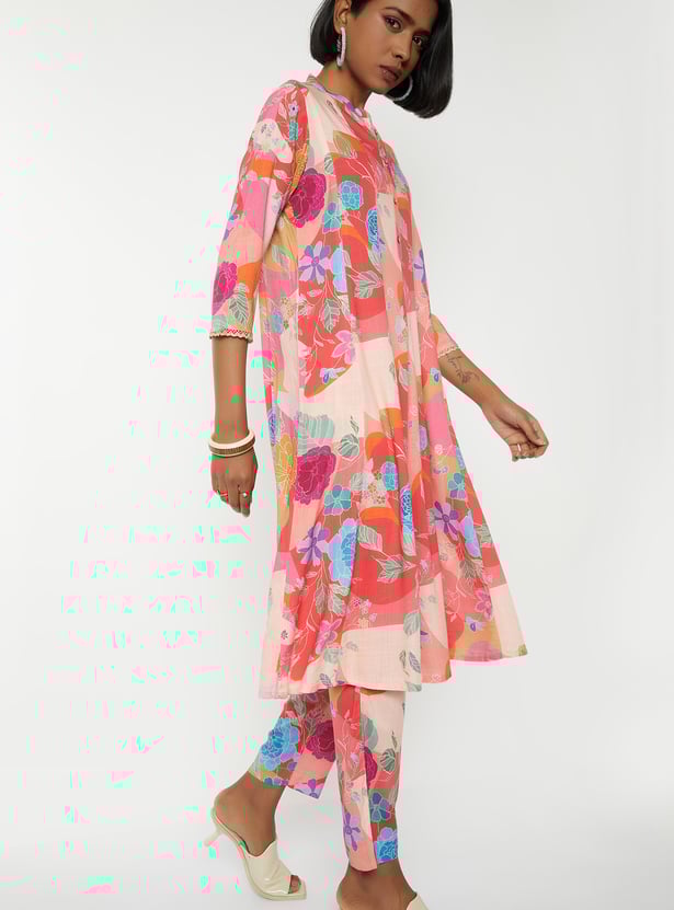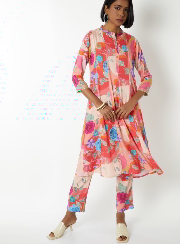 Add a touch of elegance to your wardrobe with this floral print A-line kurta set. Featuring a band collar and 3/4th sleeves, the kurta is paired with comfortable, elasticated waist straight pants for a stylish yet effortless look.