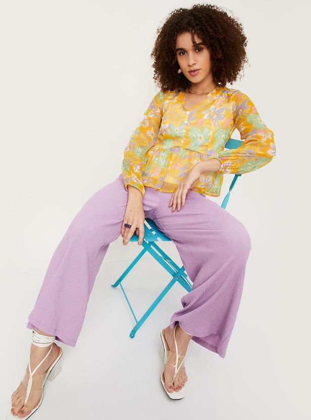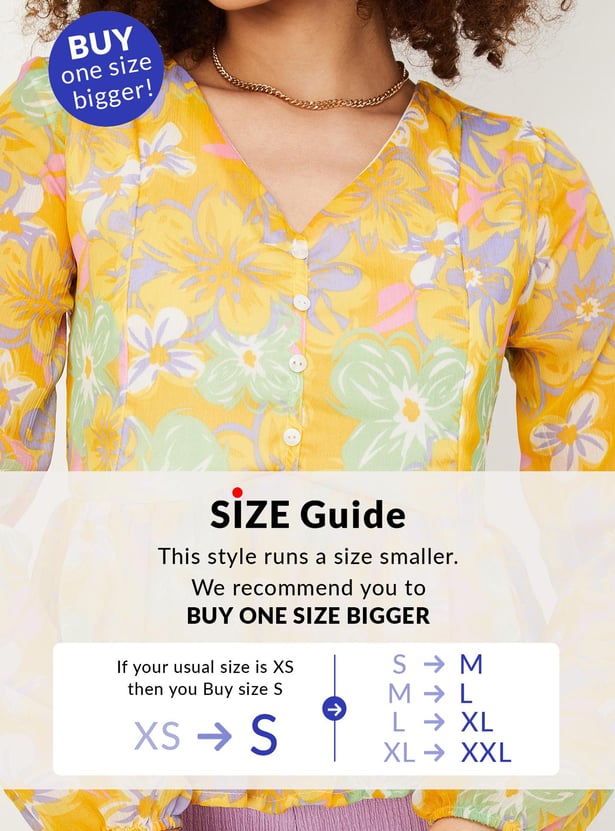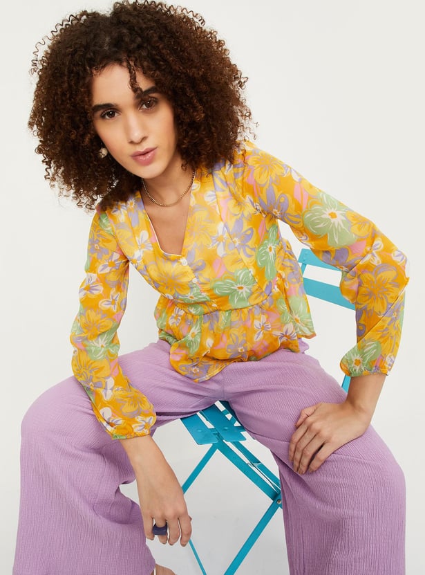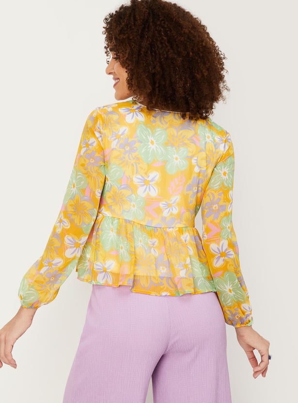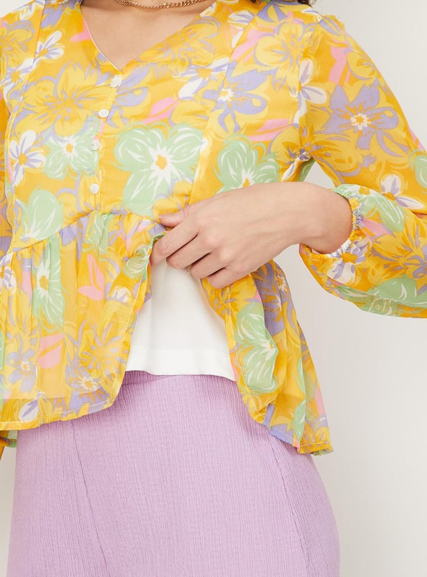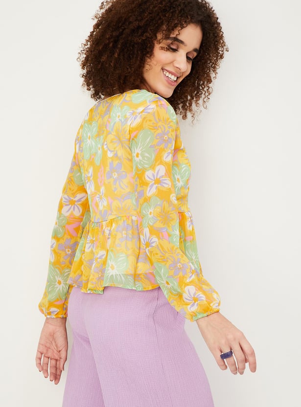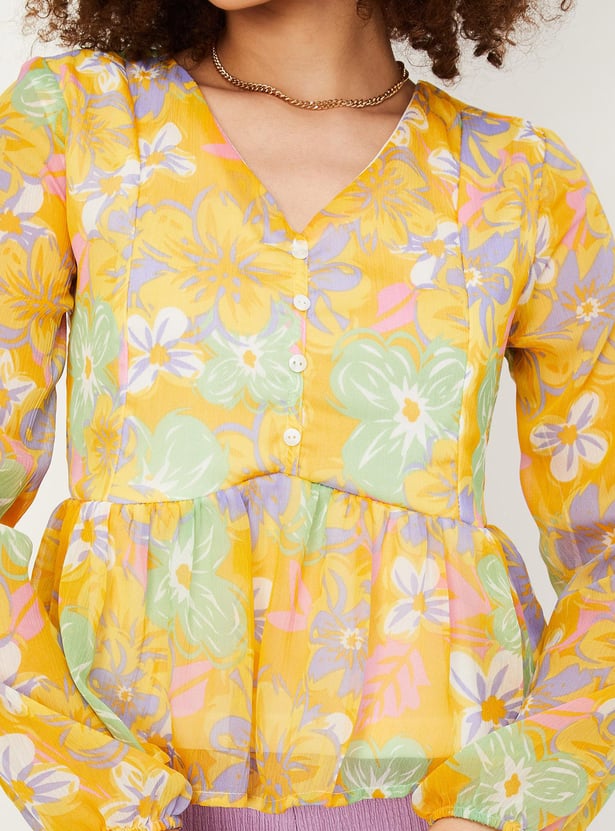 Add elegance to your everyday wardrobe with this top that is updated with all-over floral prints. It is designed with a V-neck, full sleeves, a button placket, an inner lining and a peplum hem. Complete the look by styling this top with a pair of trousers and stilettos.
