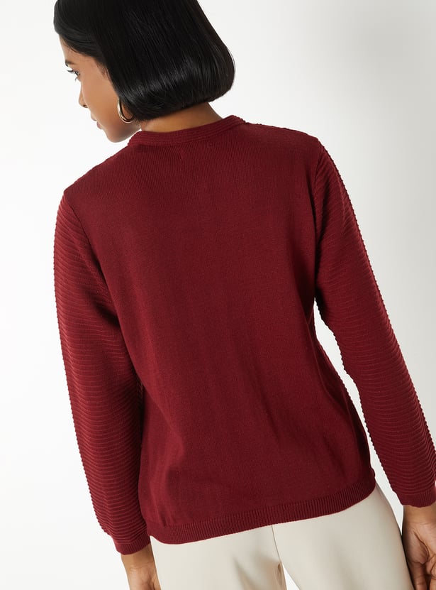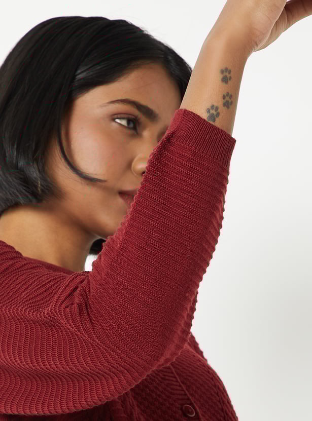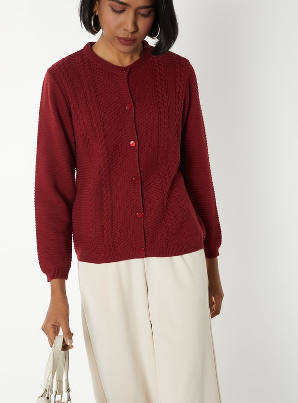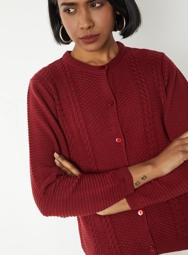 Step out in cozy style with this knit cardigan. Featuring a round neck, button placket, and full sleeves, it’s perfect for layering over casual or semi-formal outfits.