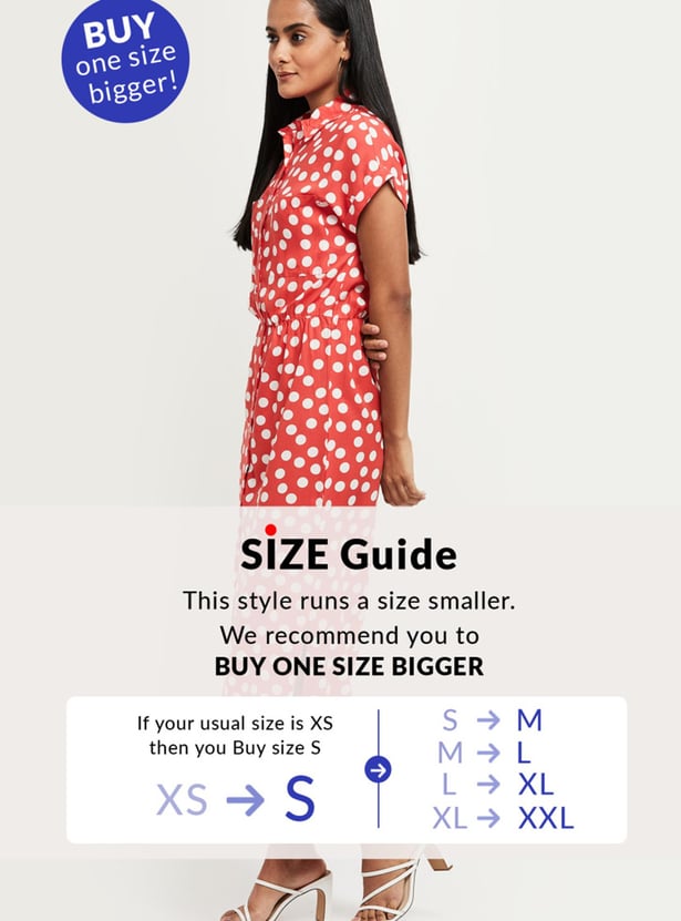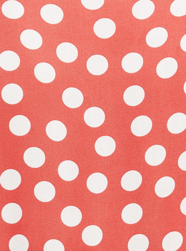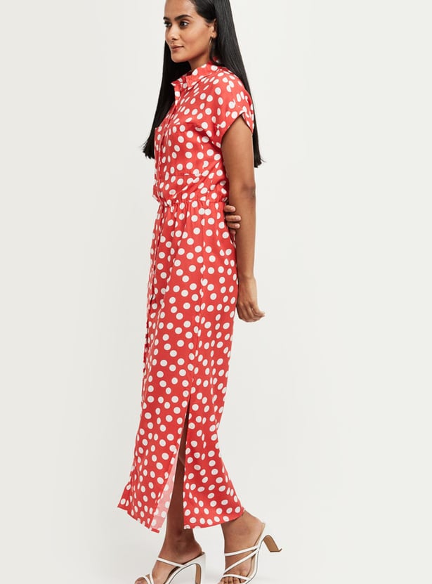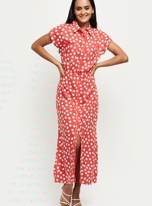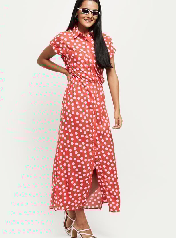 Defined by a polka dot print on the surface, this shirt dress features an A-line silhouette. It is complemented with a cinched waist, a spread collar, and half sleeves.