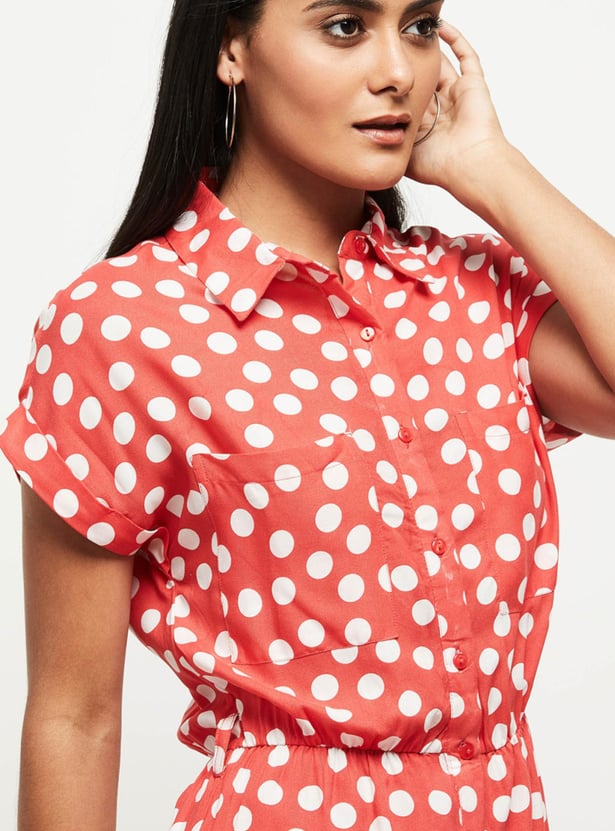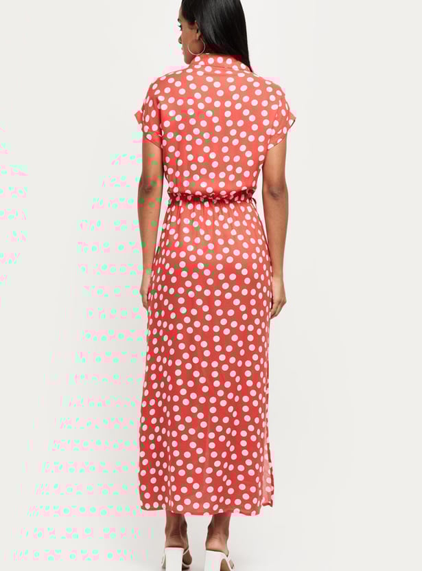 Women Polka Dot Print Short Sleeves Shirt Dress