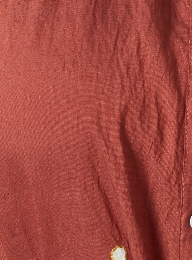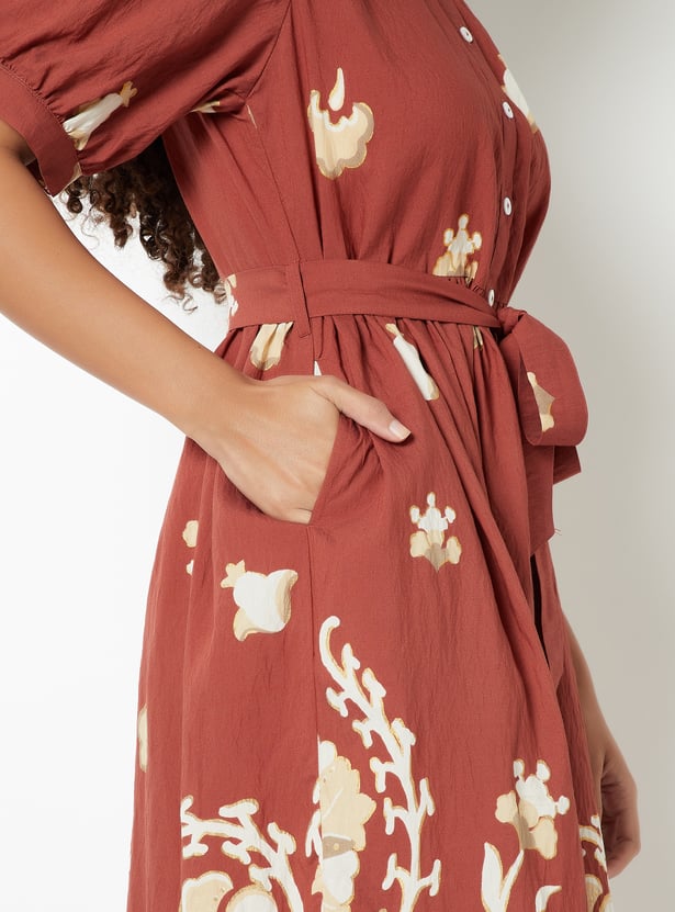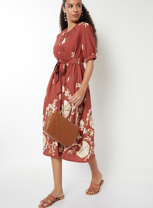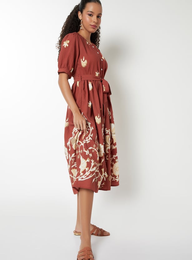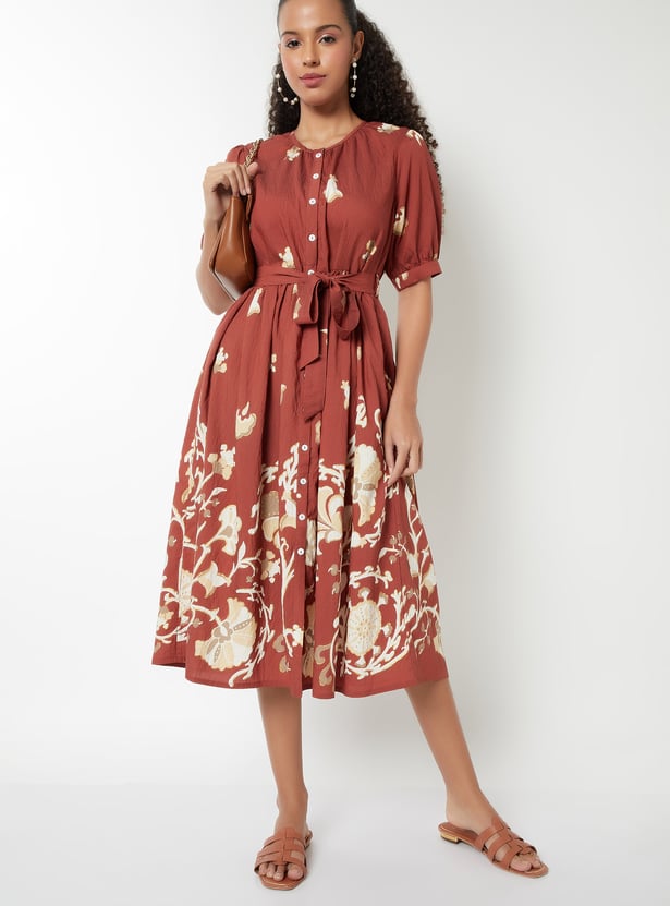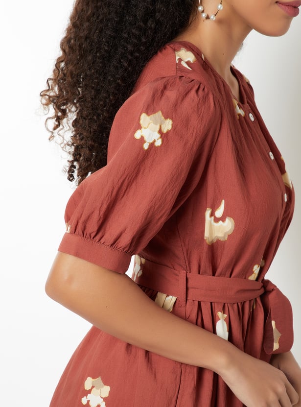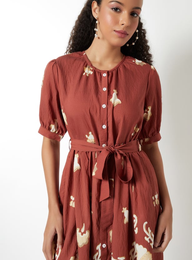 Add a playful touch to your wardrobe with this printed A-line belted dress, featuring a round neck, side pocket, and button closure. Puff half sleeves and a knee-length silhouette complete the feminine look.