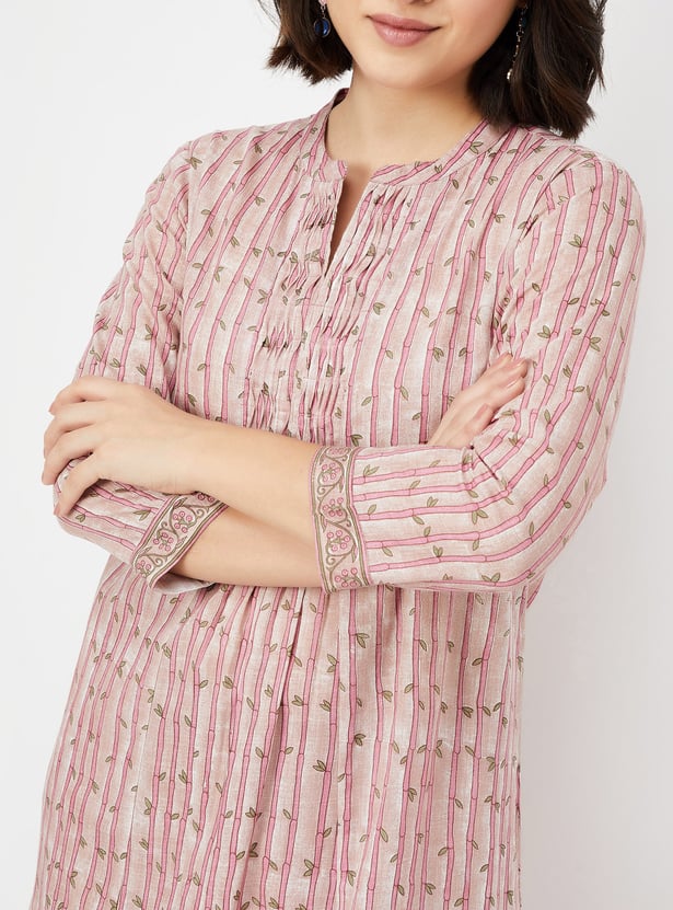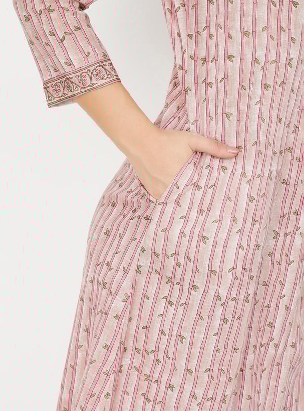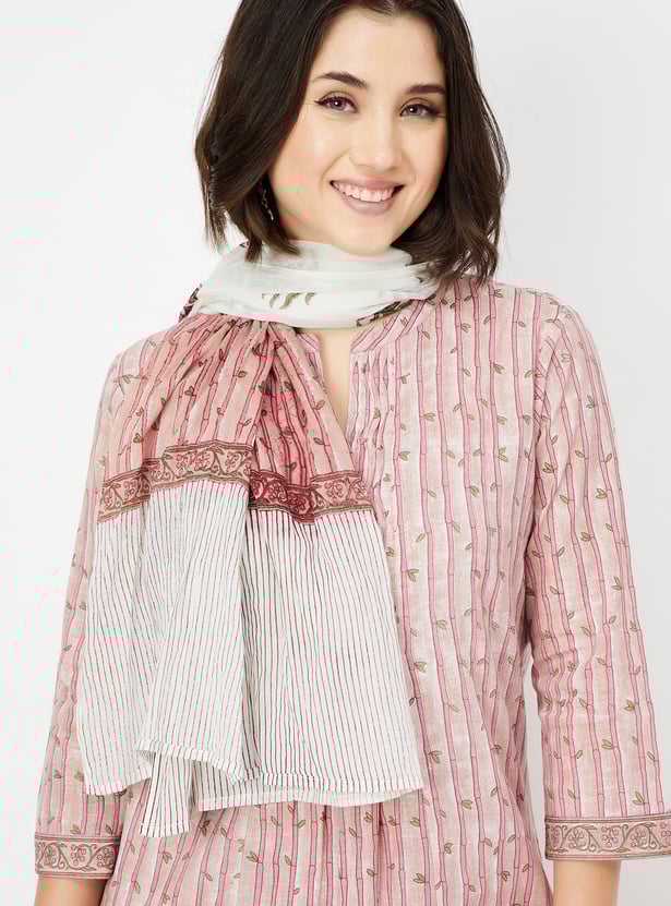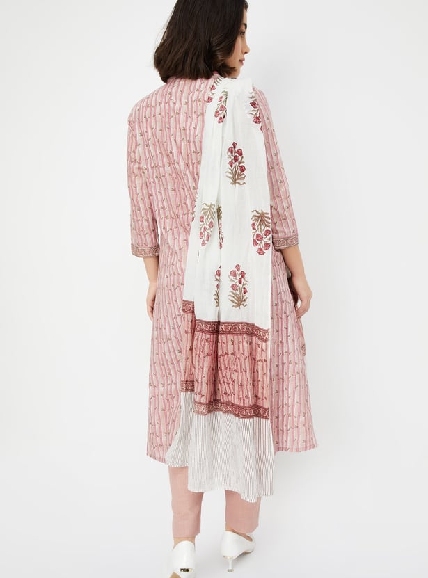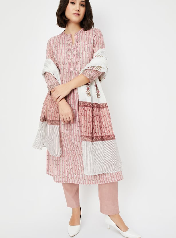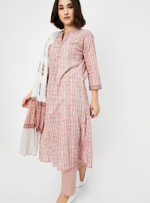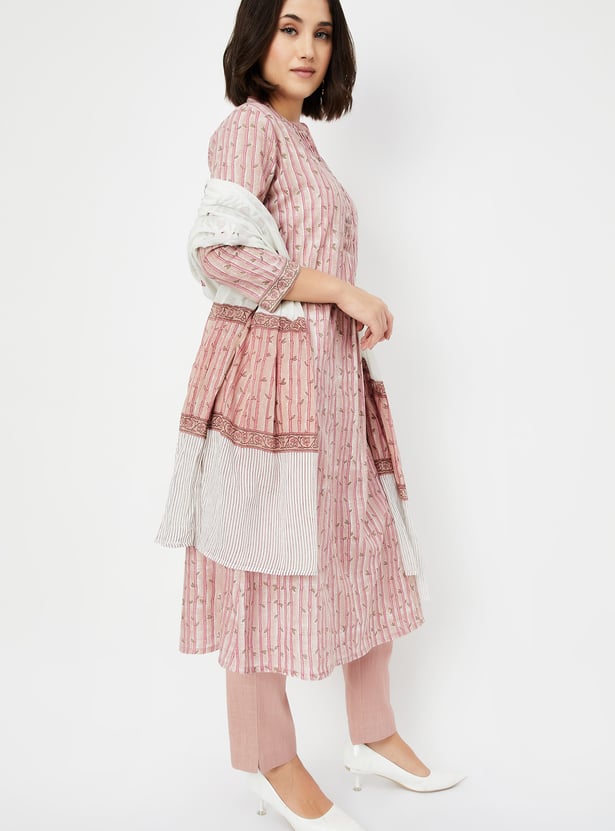 Embrace timeless charm with this printed A-line kurta set. Featuring a mandarin collar neck, 3/4th sleeves, and a convenient side pocket, this kurta combines style and practicality effortlessly. The set includes straight pants with an elasticated waist and is complemented with a dupatta for a complete look.