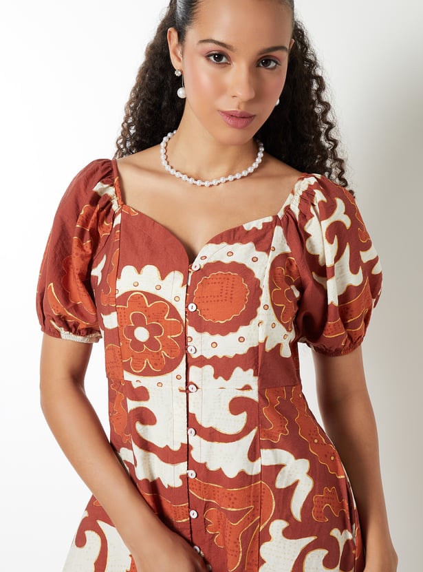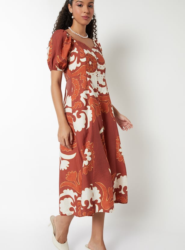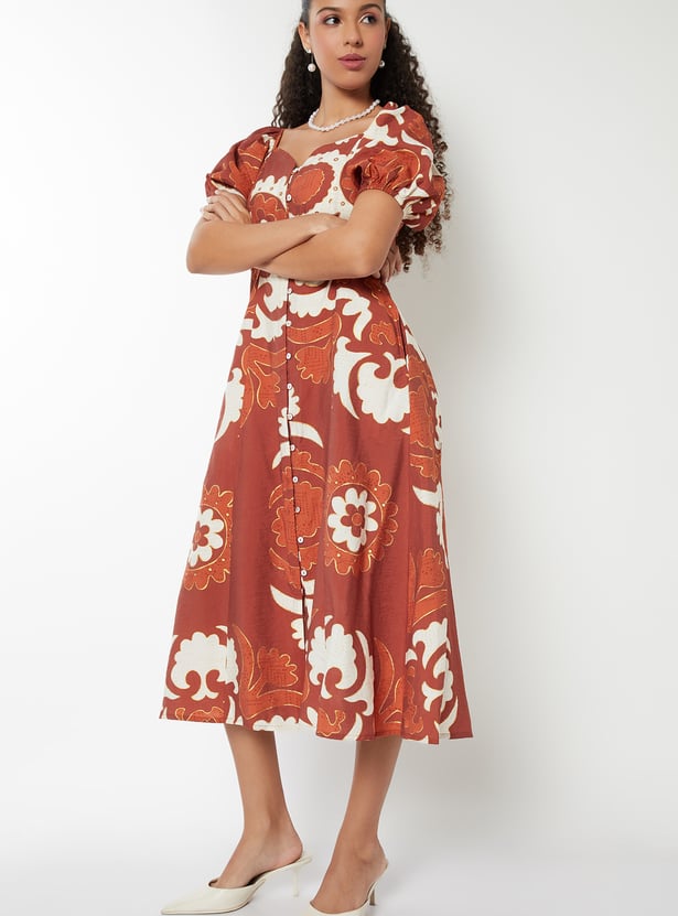 This printed midi dress adds a romantic flair to your wardrobe with its sweetheart neckline, side pocket, and buttoned front. Half sleeves offer a balanced silhouette, making it perfect for both casual and dressy occasions.