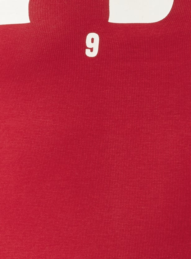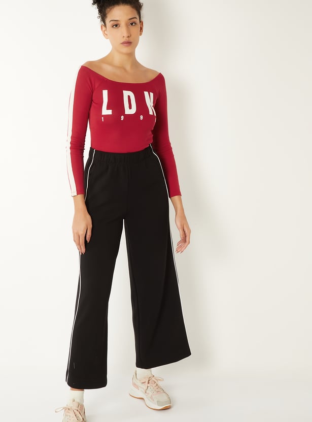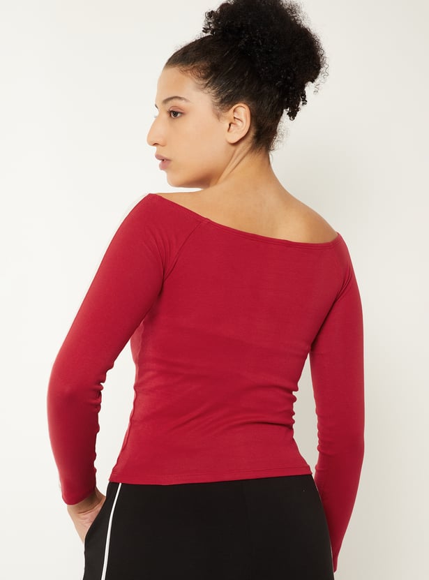 This printed off-shoulder T-shirt is designed in a snug fit with full sleeves, creating a sleek, body-skimming silhouette. The bold print adds standout appeal, making it a confident pick for casual styling.