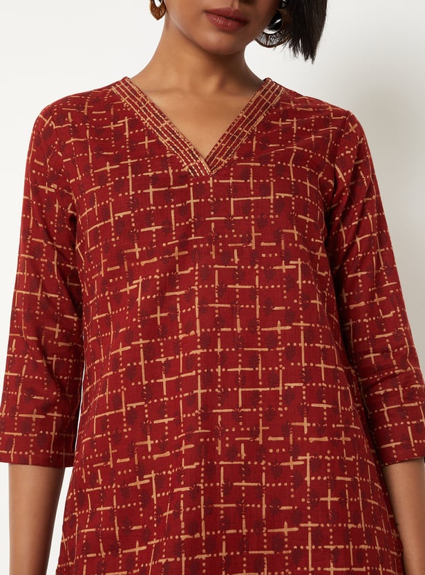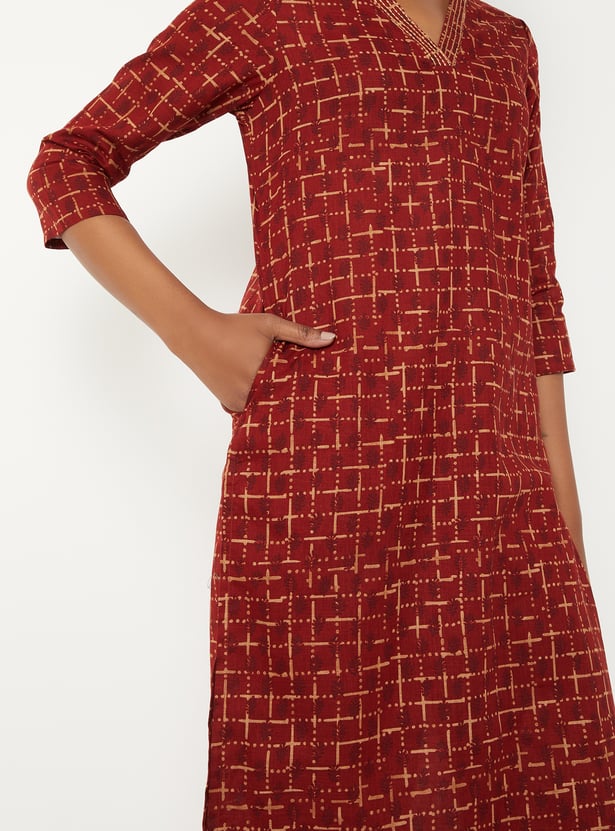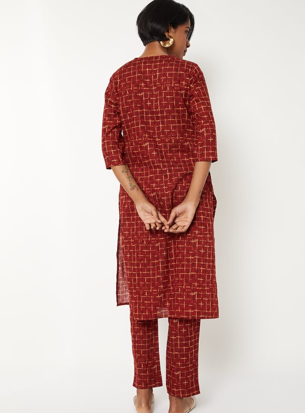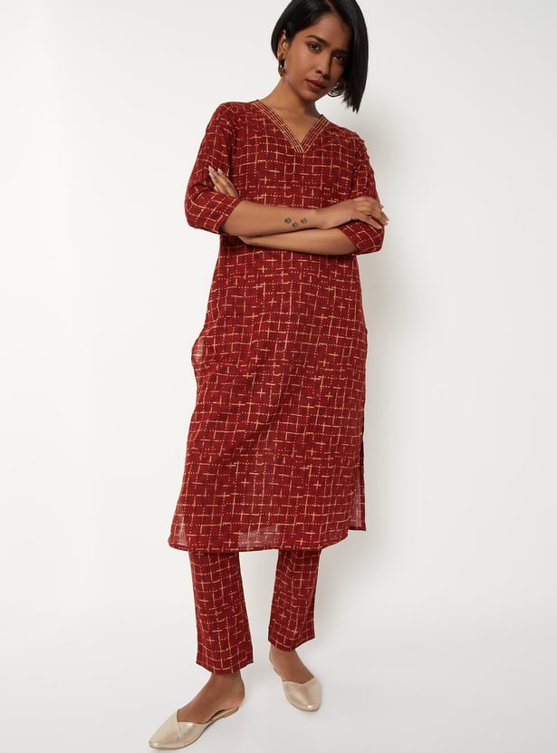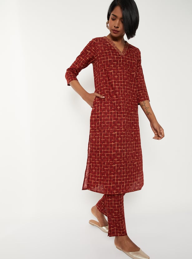 Elegant yet comfortable, this printed straight kurta set is designed with a v-neck, 3/4th sleeves, side pocket, and side slits for ease of movement. It is paired with straight pants featuring an elasticated waist, offering both style and comfort in a coordinated ensemble.