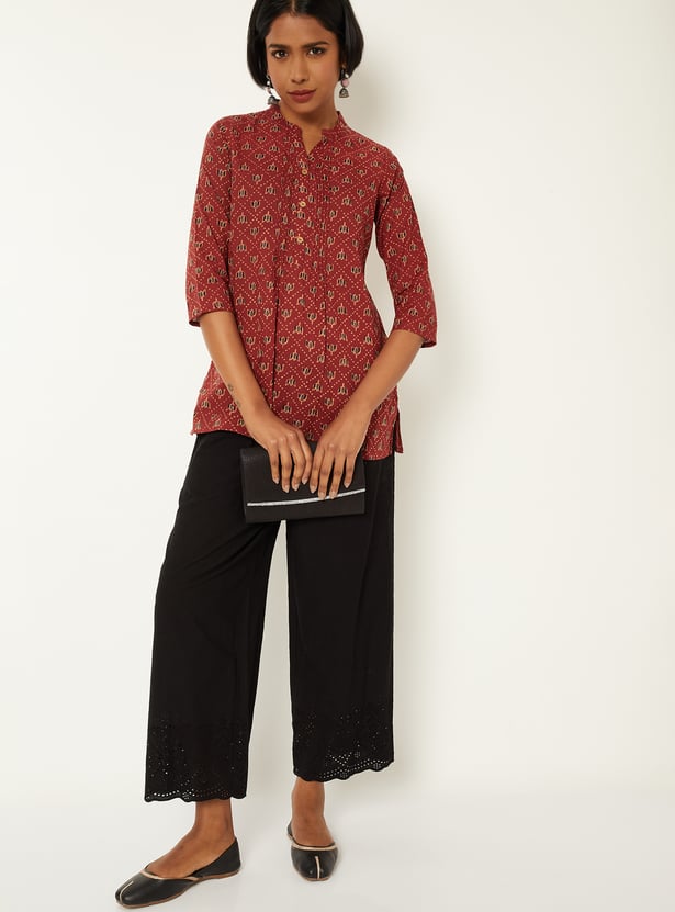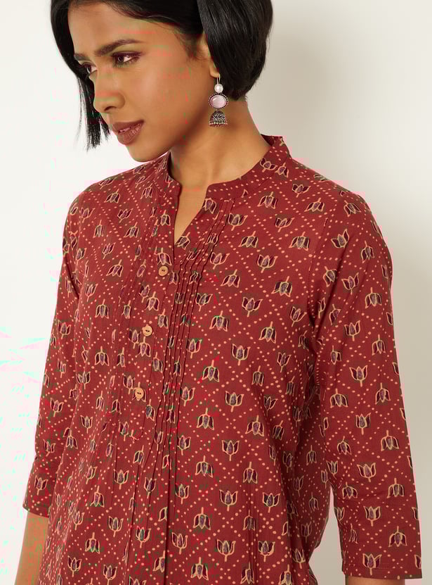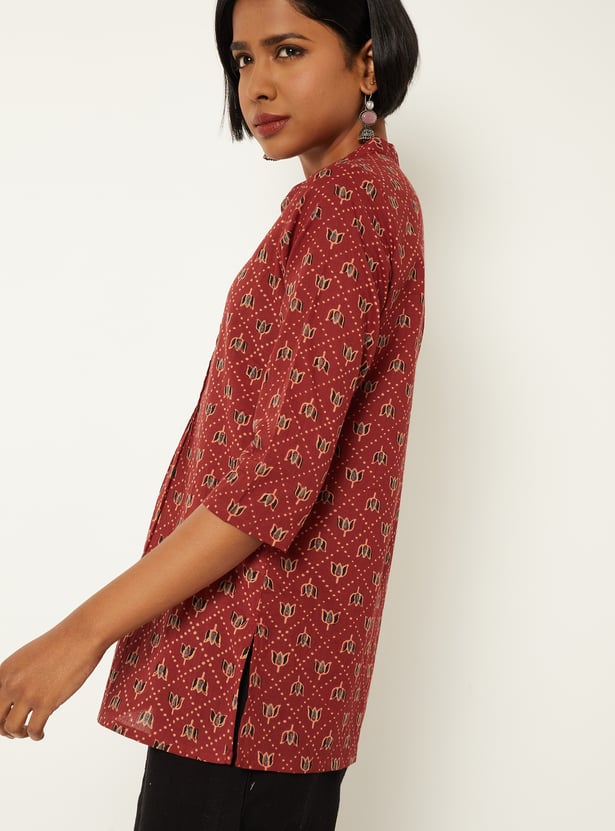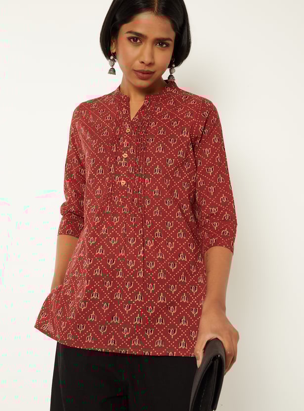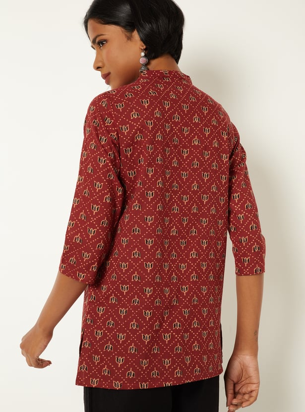 This printed tunic features an all-over print with a neat placket and a short length for everyday ease. Designed with 3/4th sleeves, a band collar, and a regular fit, it offers a clean, versatile silhouette.